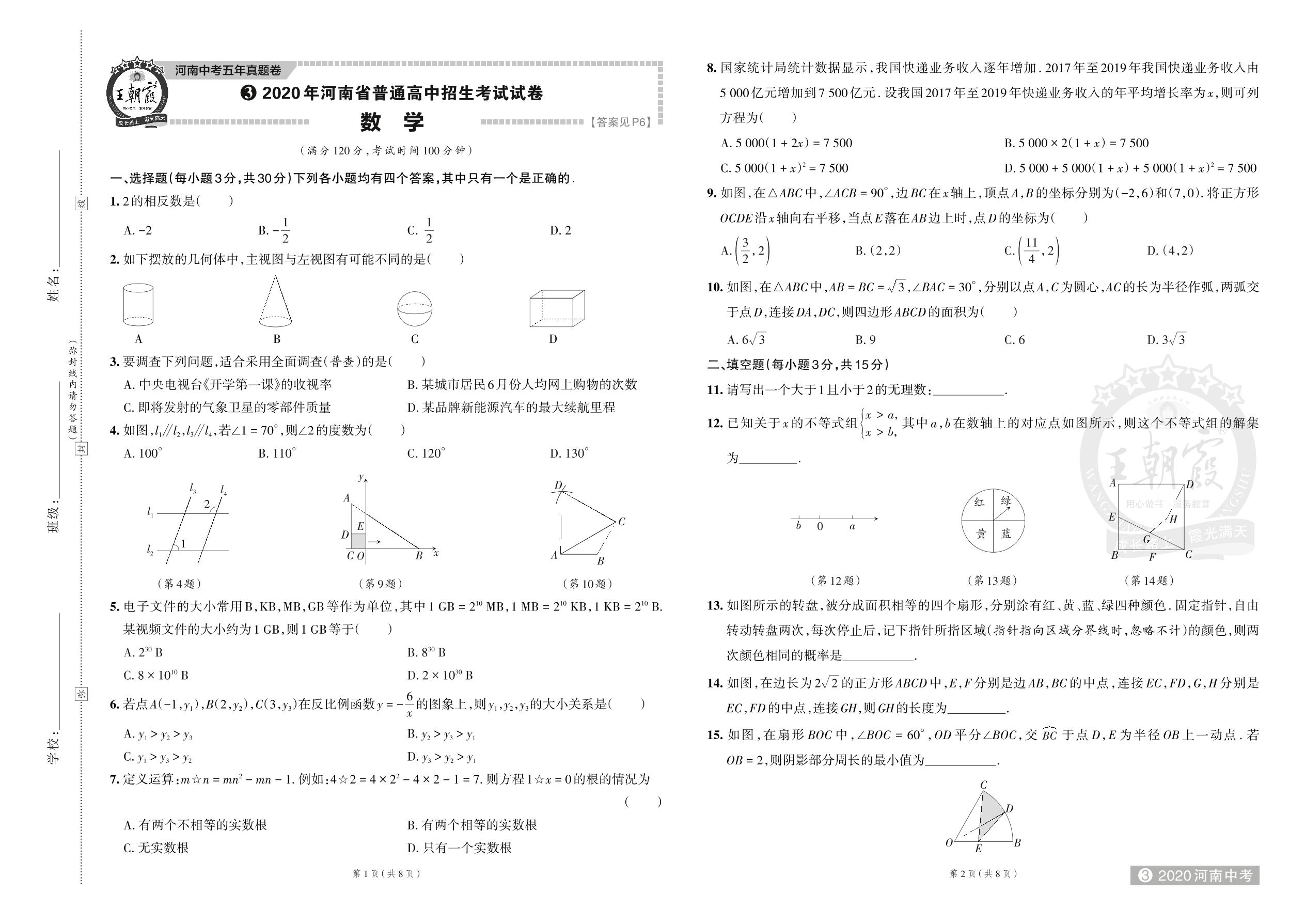 2020年河南省普通高中招生考试试卷·数学【3】