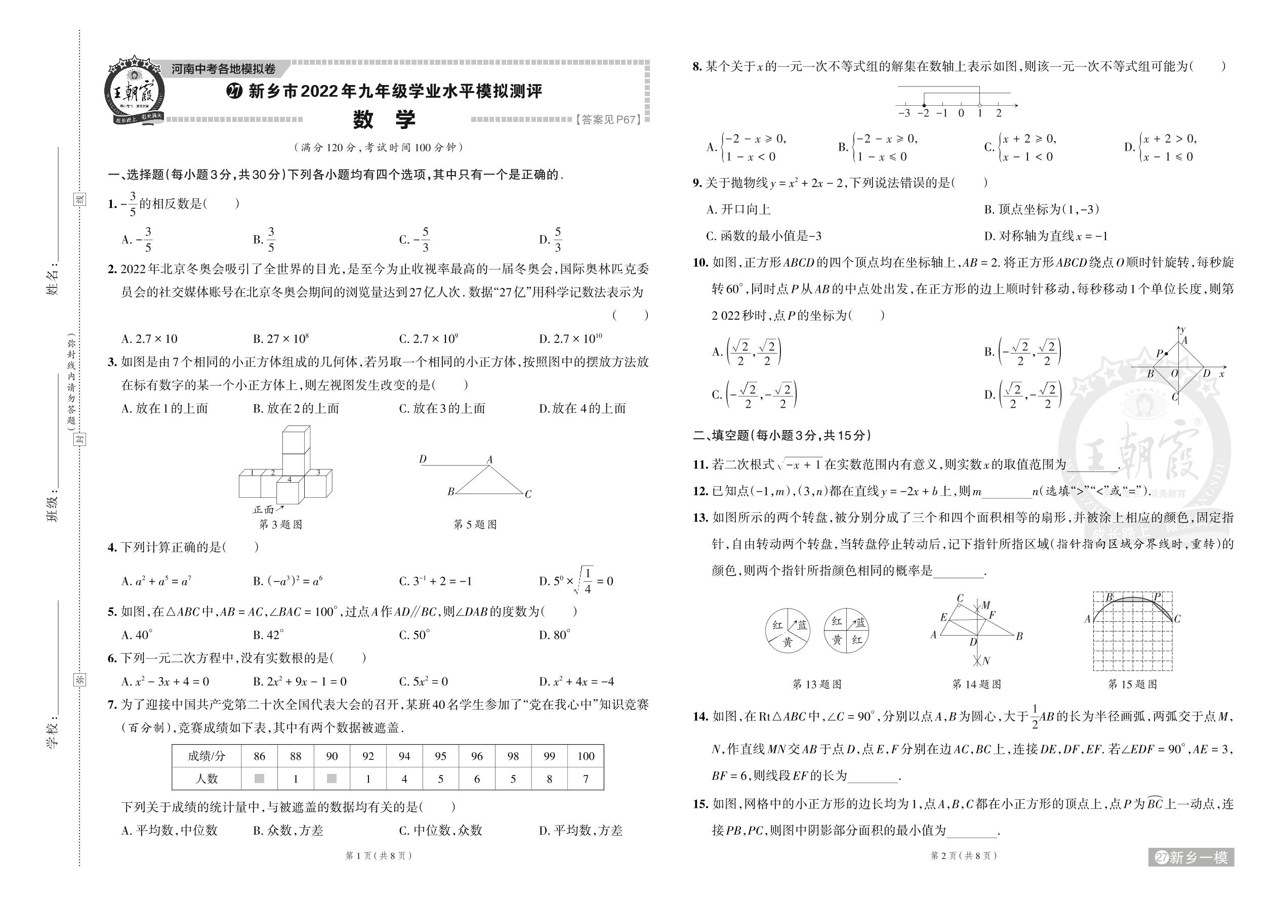 新乡市2022年九年级学业水平模拟测评·数学【27】