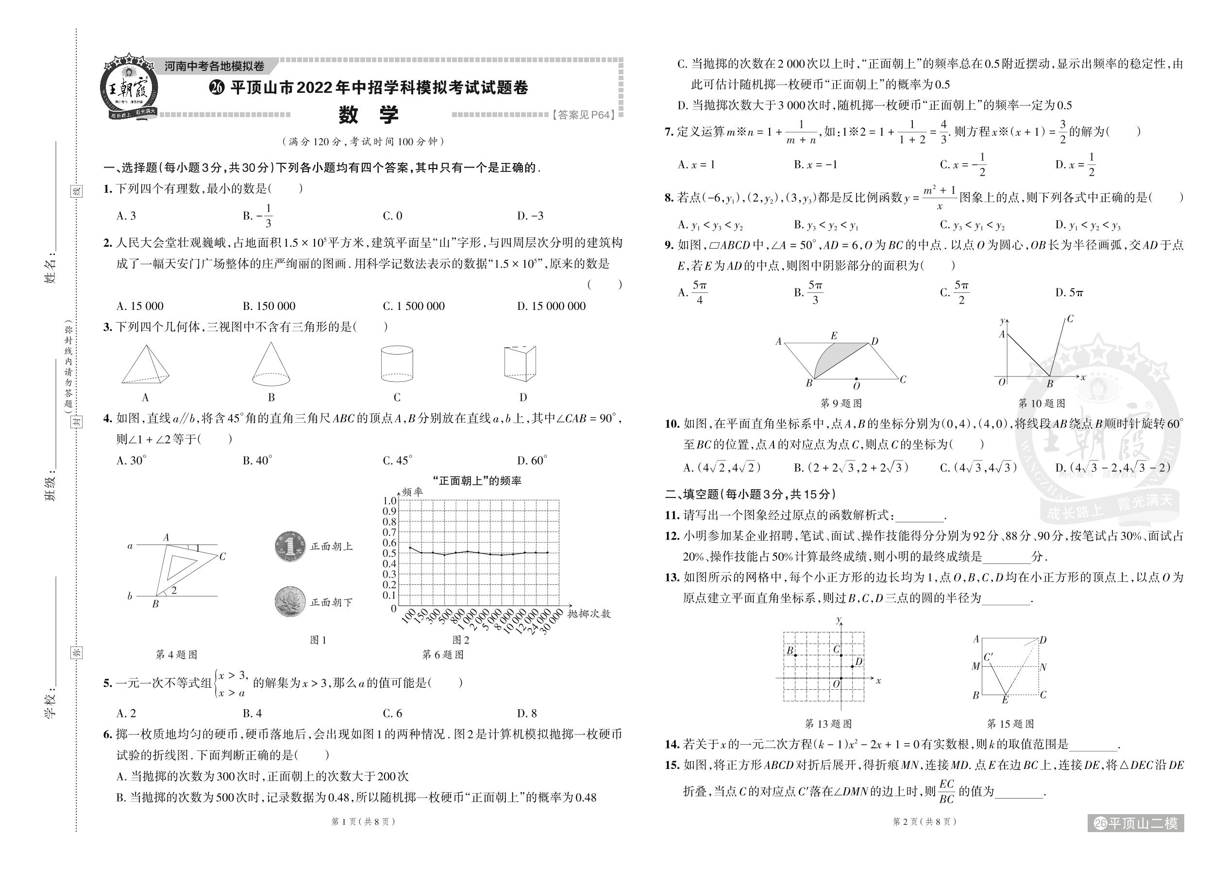 平顶山市2022年中招学科模拟考试试题卷·数学【26】