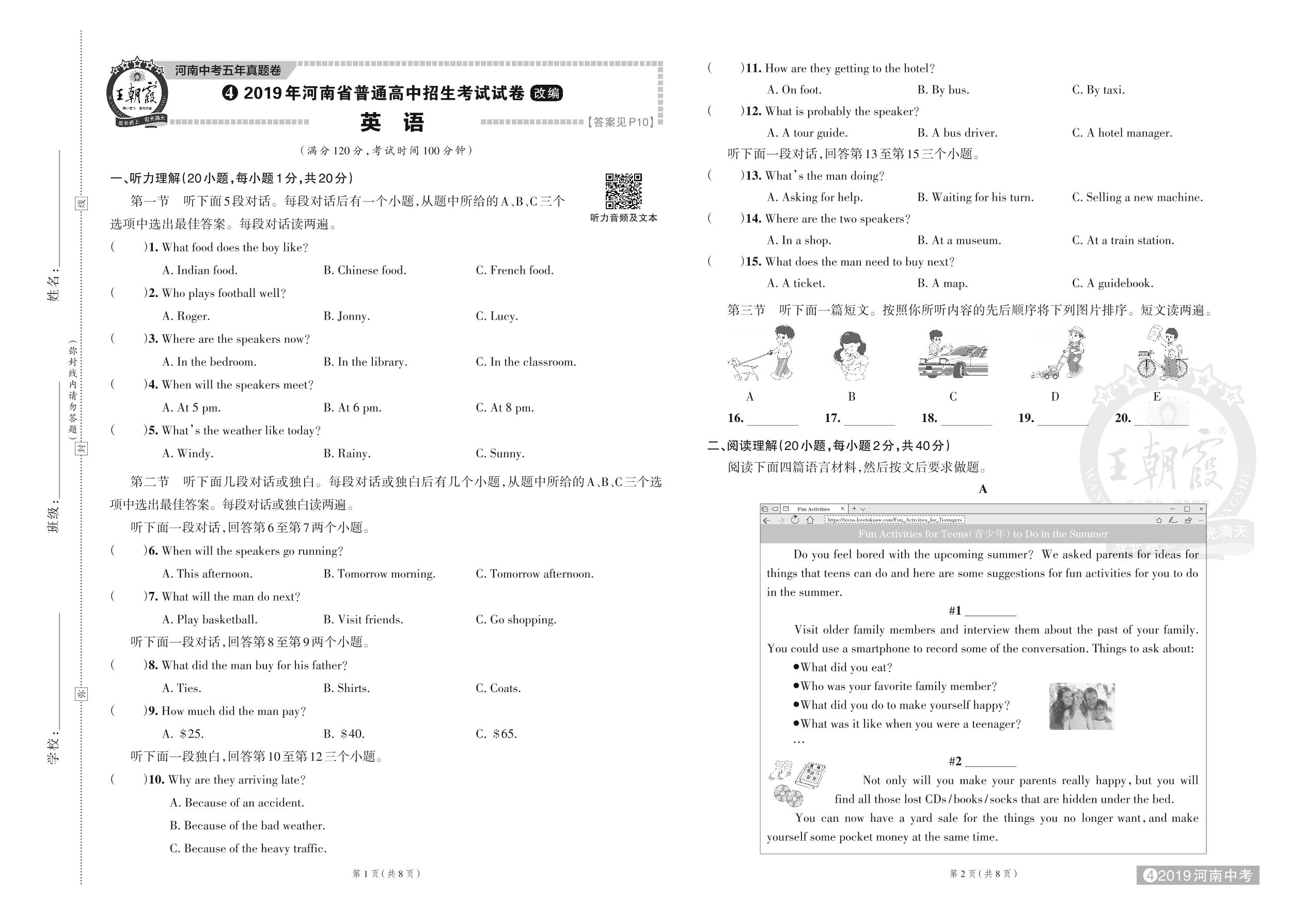 2019 年河南省普通高中招生考试试卷(改编)·英语【4】