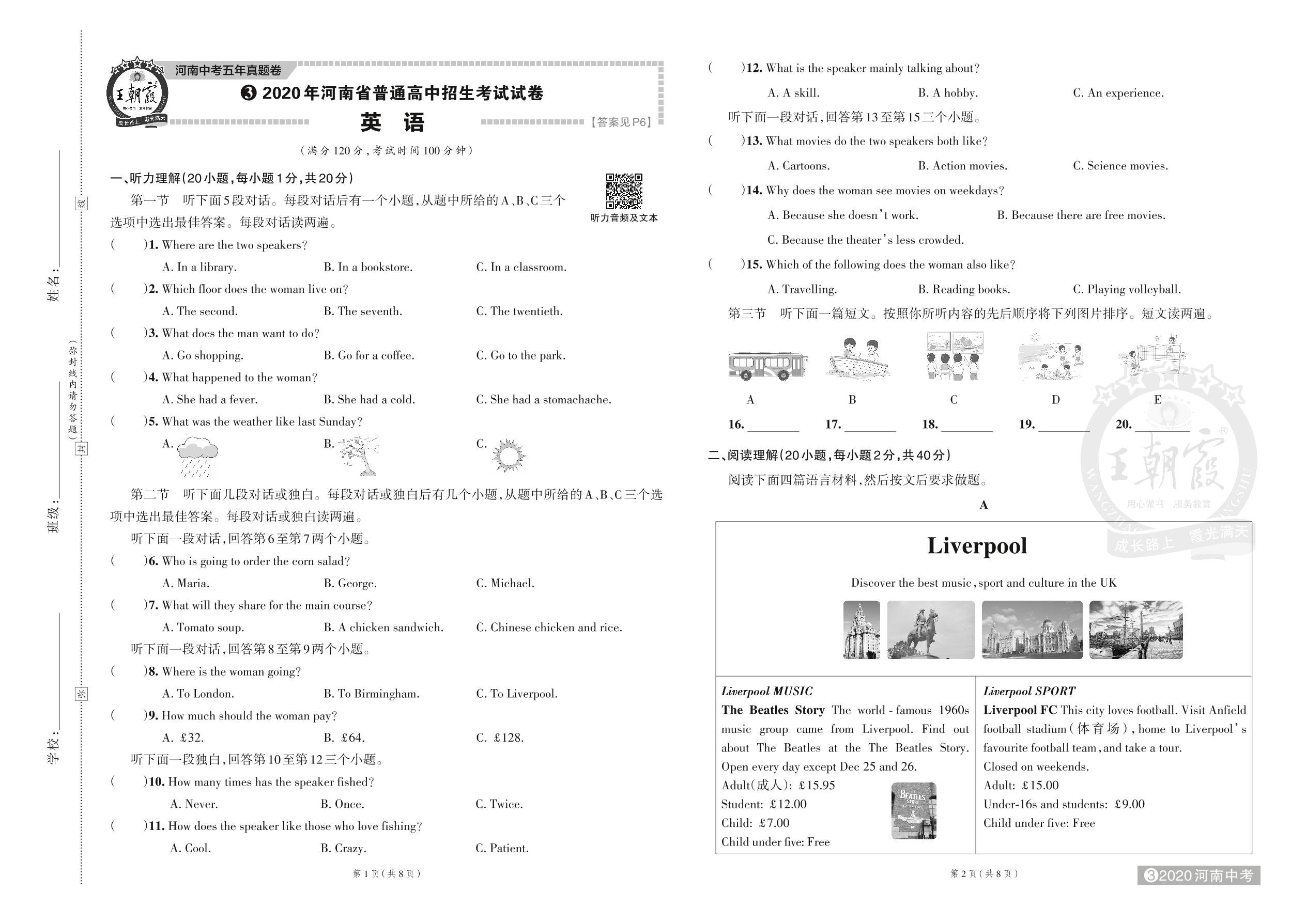 2020 年河南省普通高中招生考试试卷·英语【3】