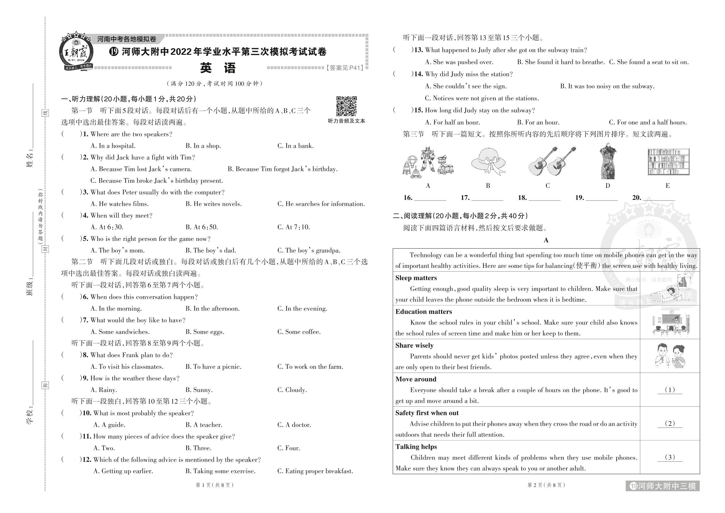 河师大附中2022年学业水平第三次模拟考试试卷·英语【19】