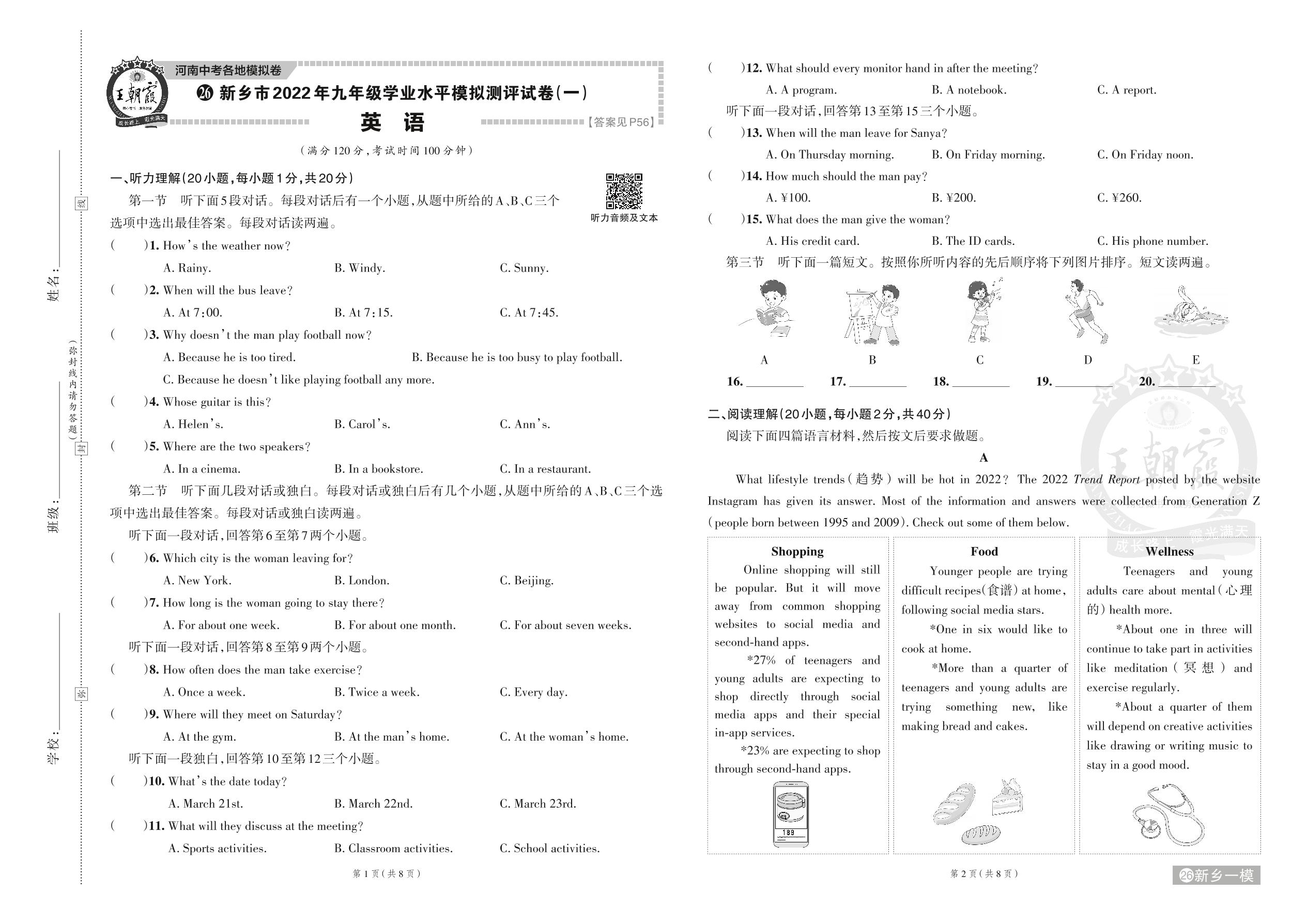 新乡市2022年九年级学业水平模拟测评试卷(一)·英语【26】