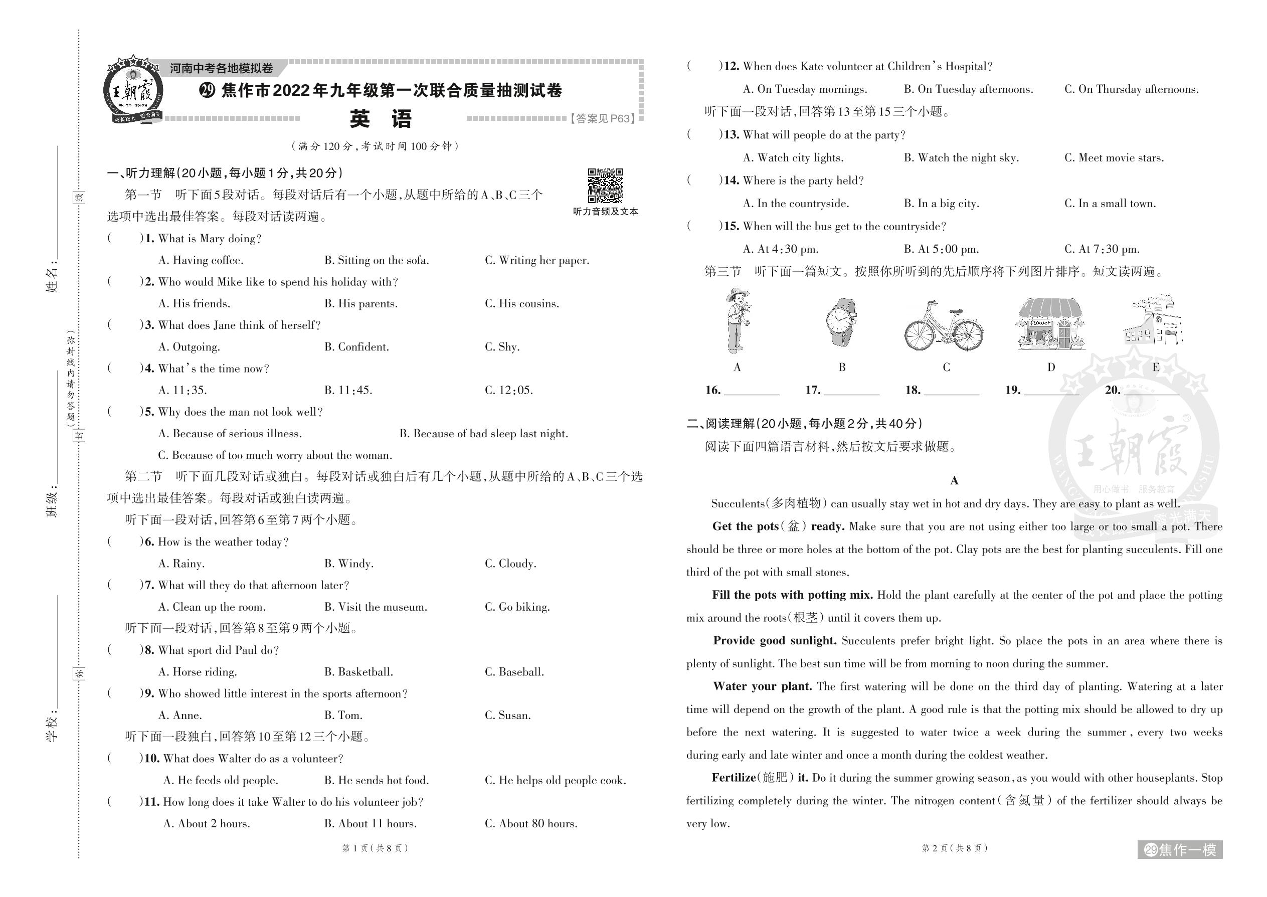 焦作市2022年九年级第一次联合质量抽测试卷·英语【29】