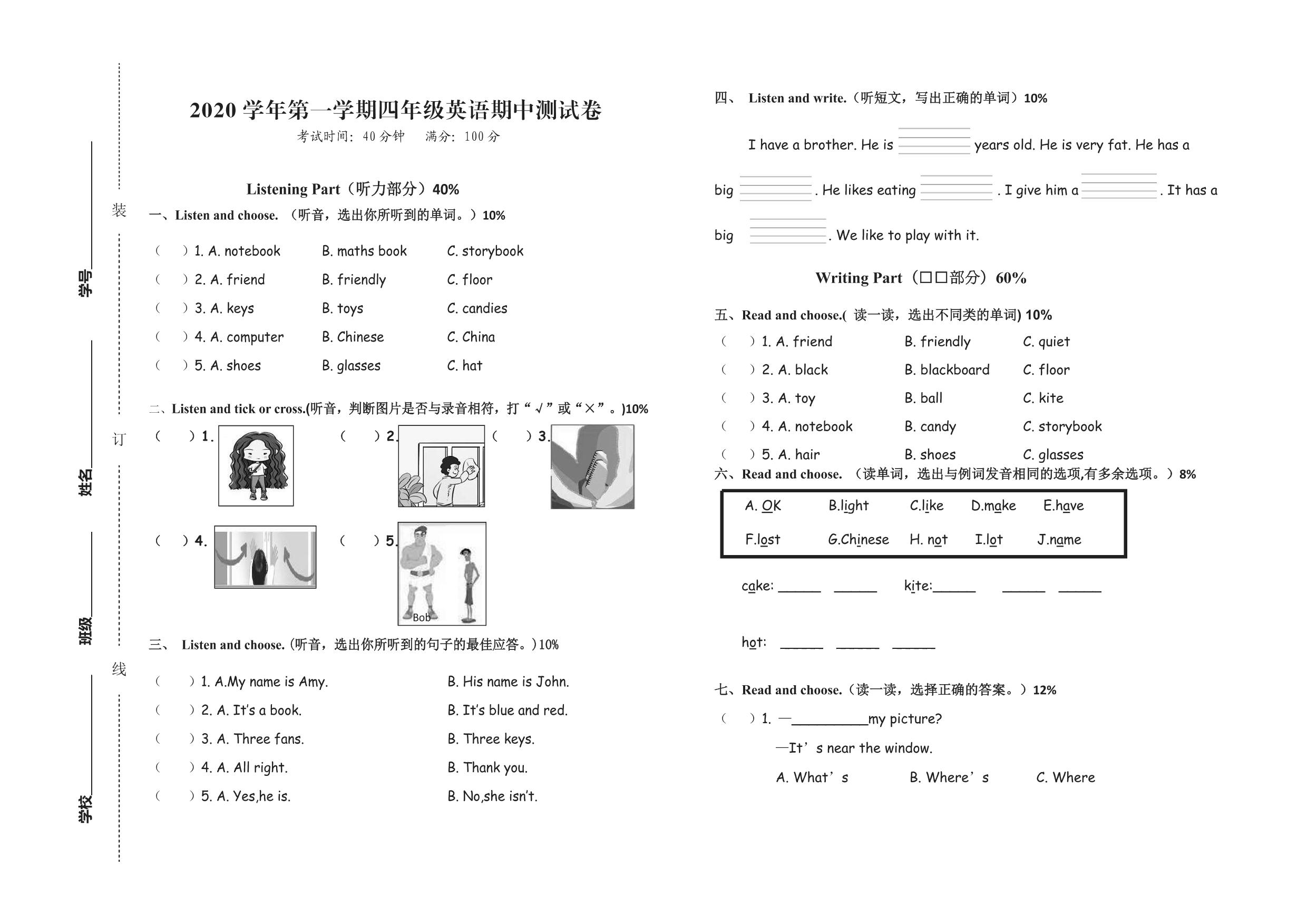 四年级英语人教PEP版(三起始)上册期中卷