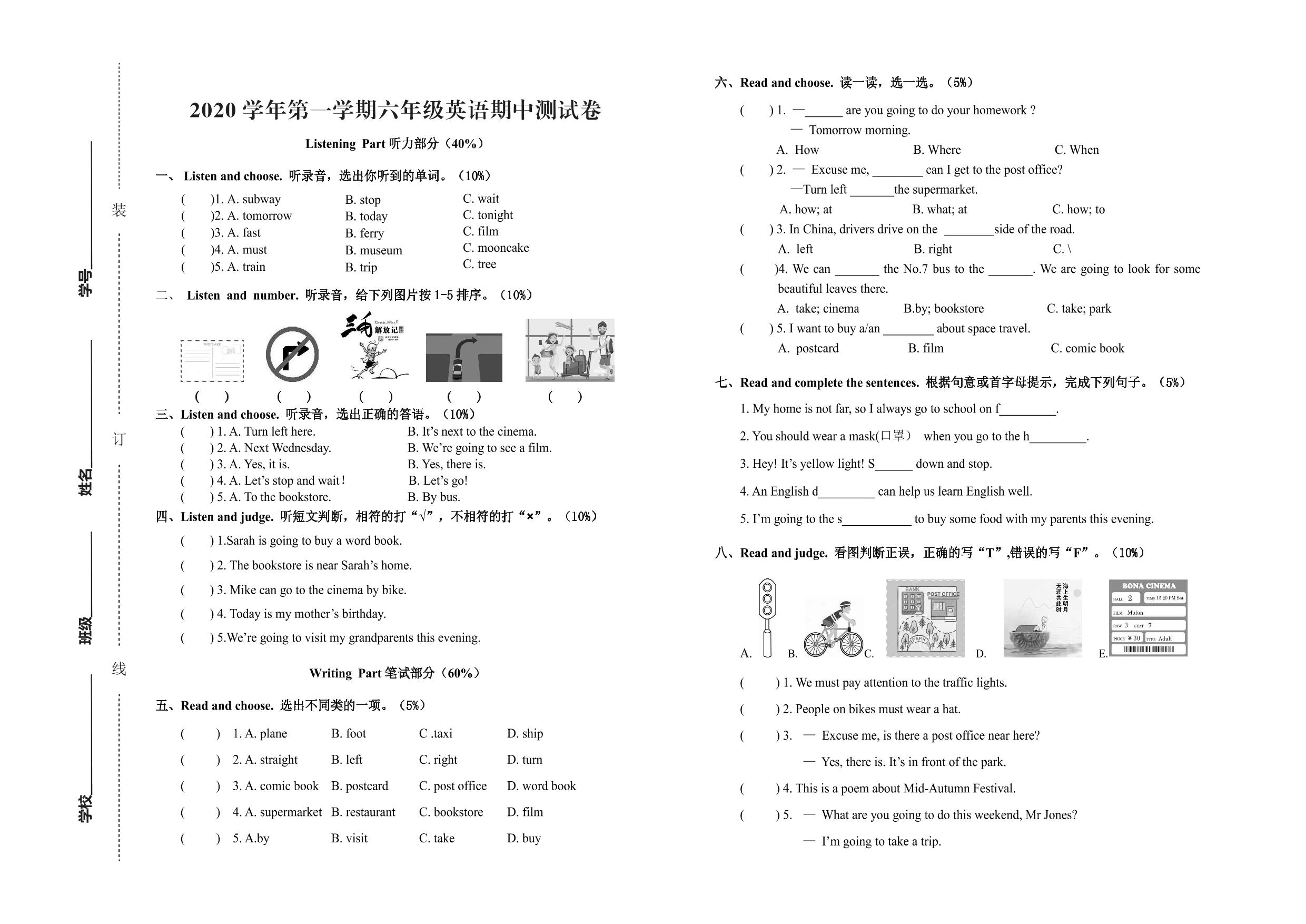 杭州市余杭区2020学年第一学期期中测试卷六年级英语(人教PEP版)【无听力音频】