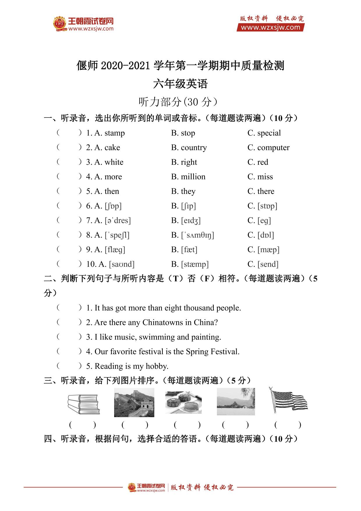 六年级英语人教PEP版(三起始)上册期中卷