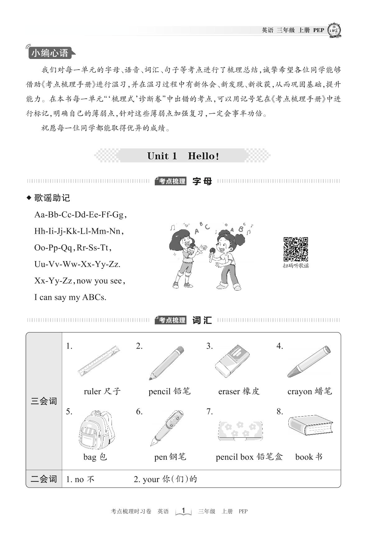 2022上册三年级英语人教PEP版 考点梳理手册——Unit 1 Hello!