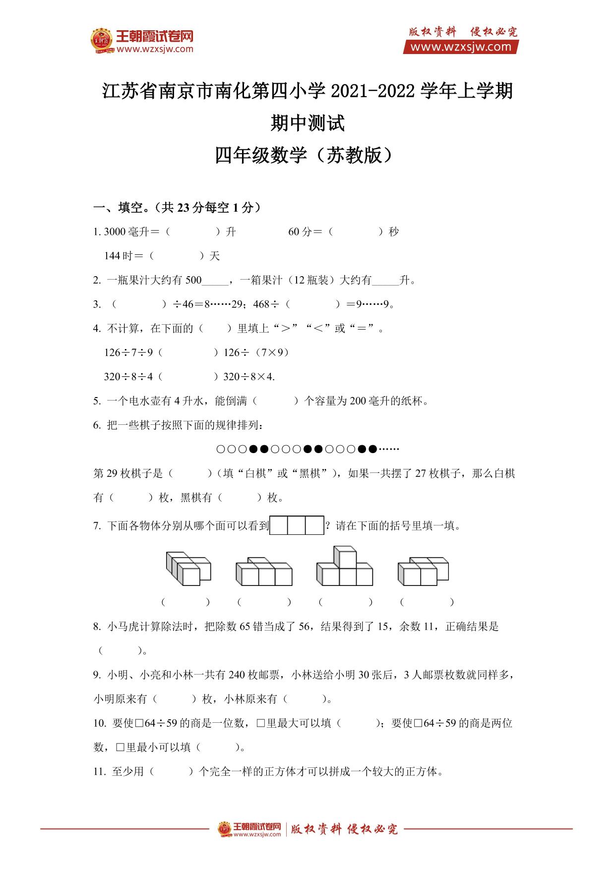 江苏省南京市南化第四小学2021-2022学年上学期期中测试四年级数学(苏教版)