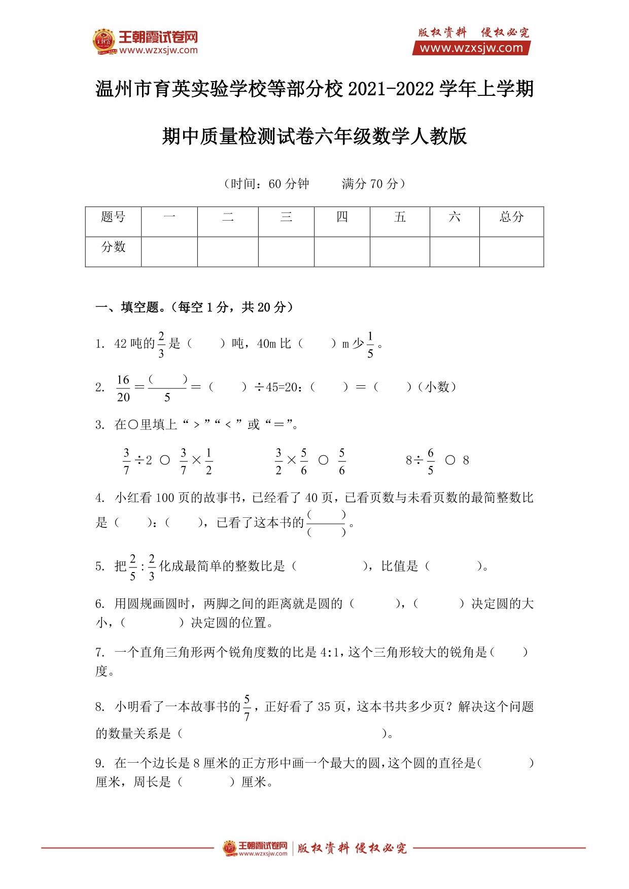 浙江省温州市育英实验学校等部分校2021-2022学年上学期期中质量检测六年级数学(人教版)