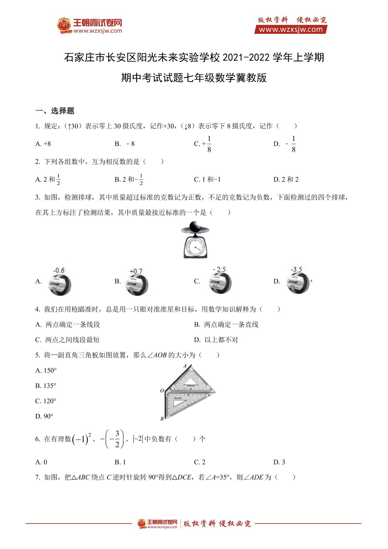 河北省石家庄市长安区阳光未来实验学校2021-2022学年上学期期中考试试题七年级数学(冀教版)