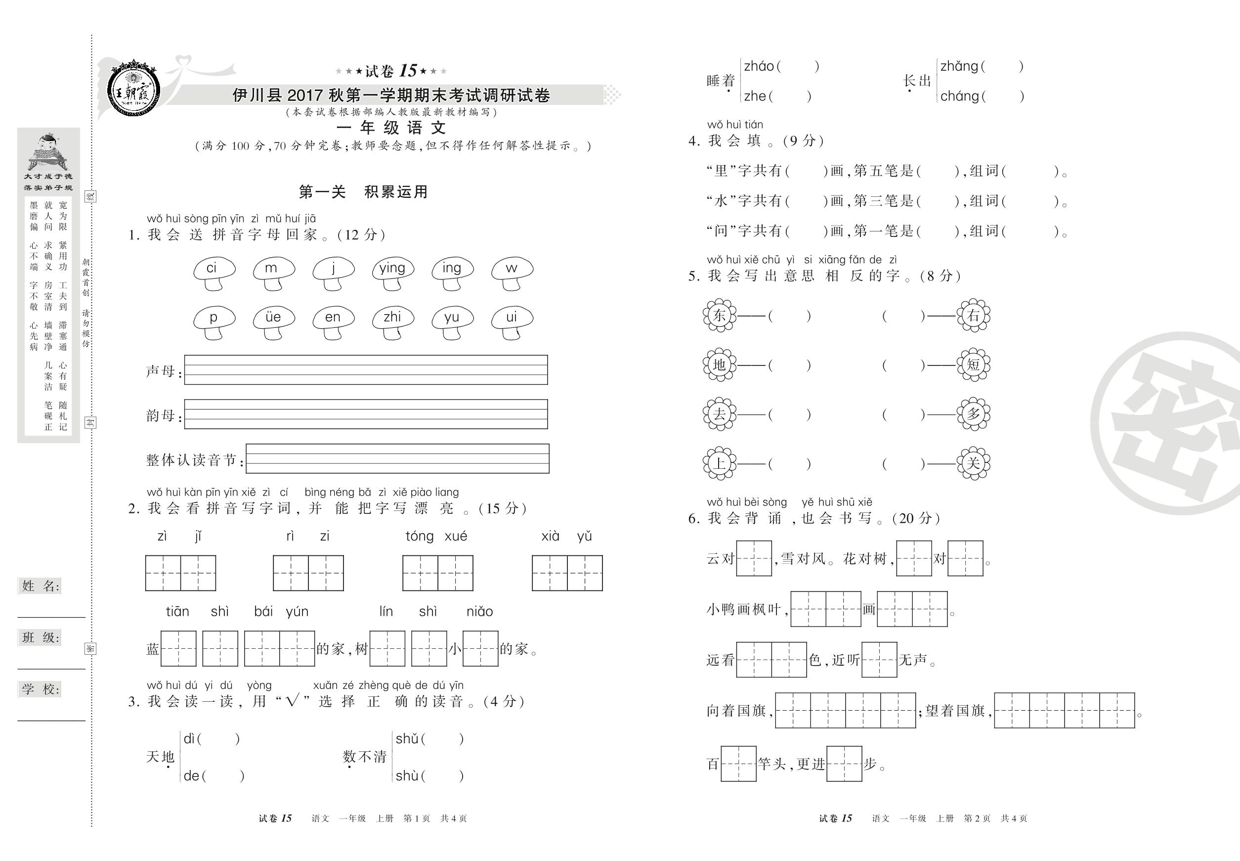 2016-2017学年第一学期洛阳市伊川县一年级语文试卷(人教版)【15】