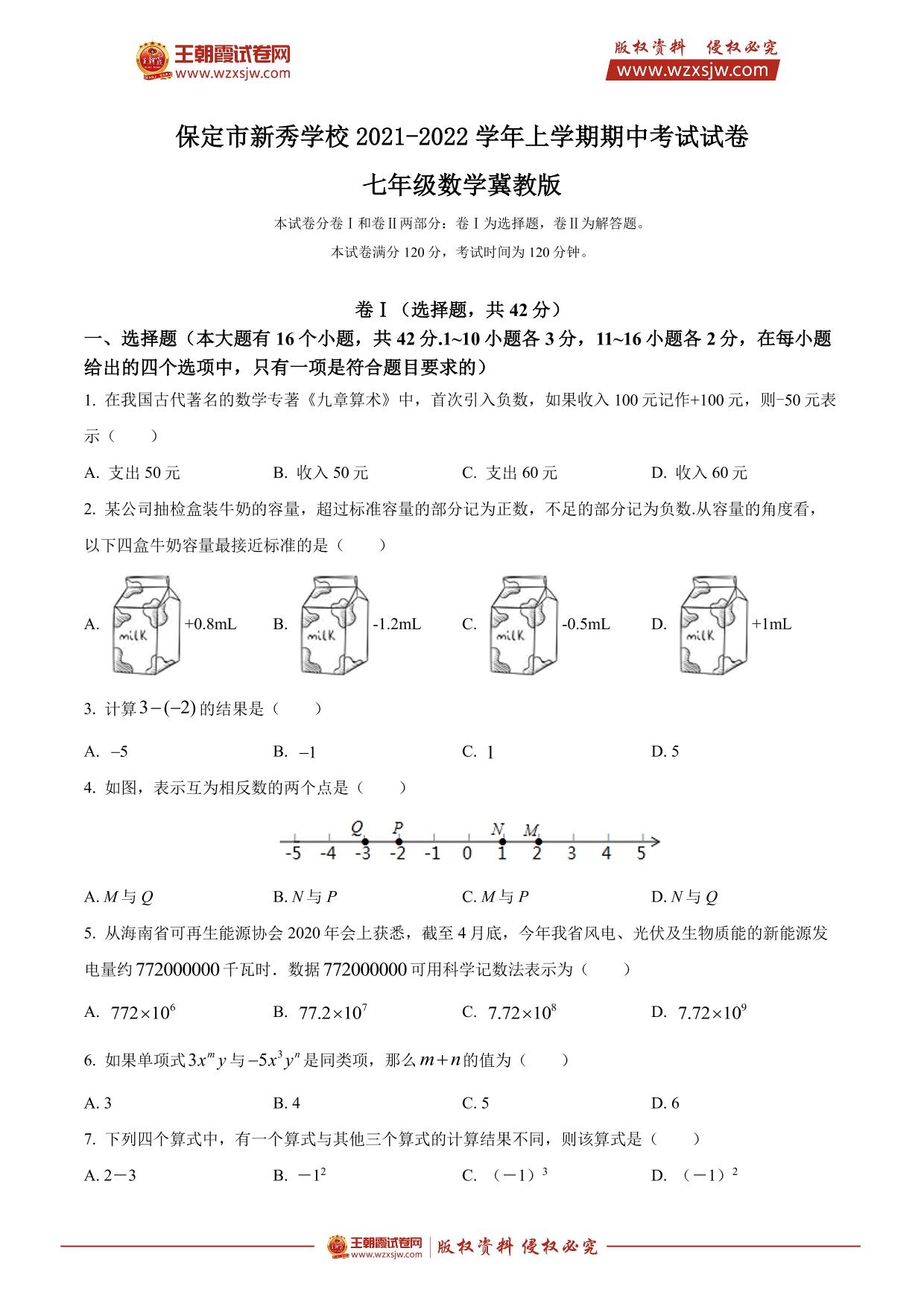 河北省保定市新秀学校2021-2022学年上学期期中考试试题七年级数学(冀教版)
