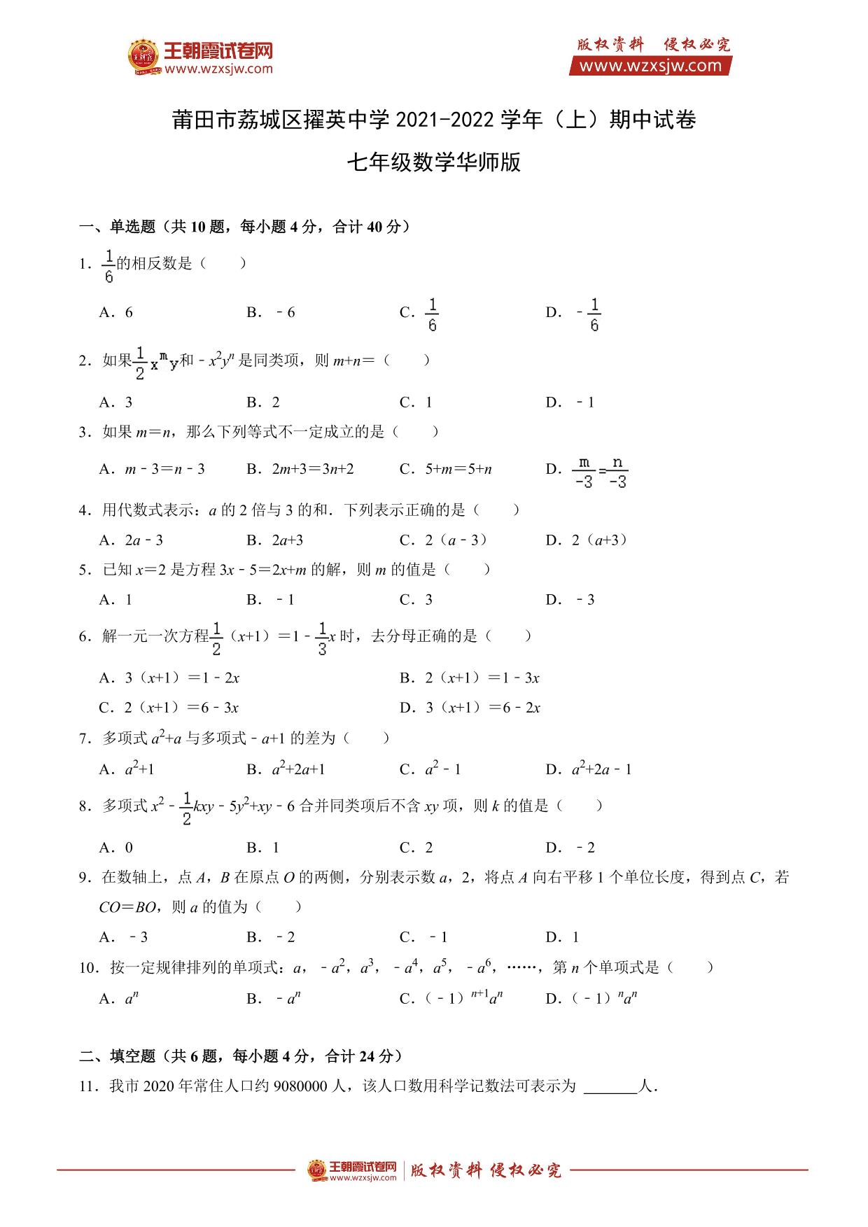 福建省莆田市擢英中学2021-2022学年上学期期中考试试卷七年级数学(华师版)