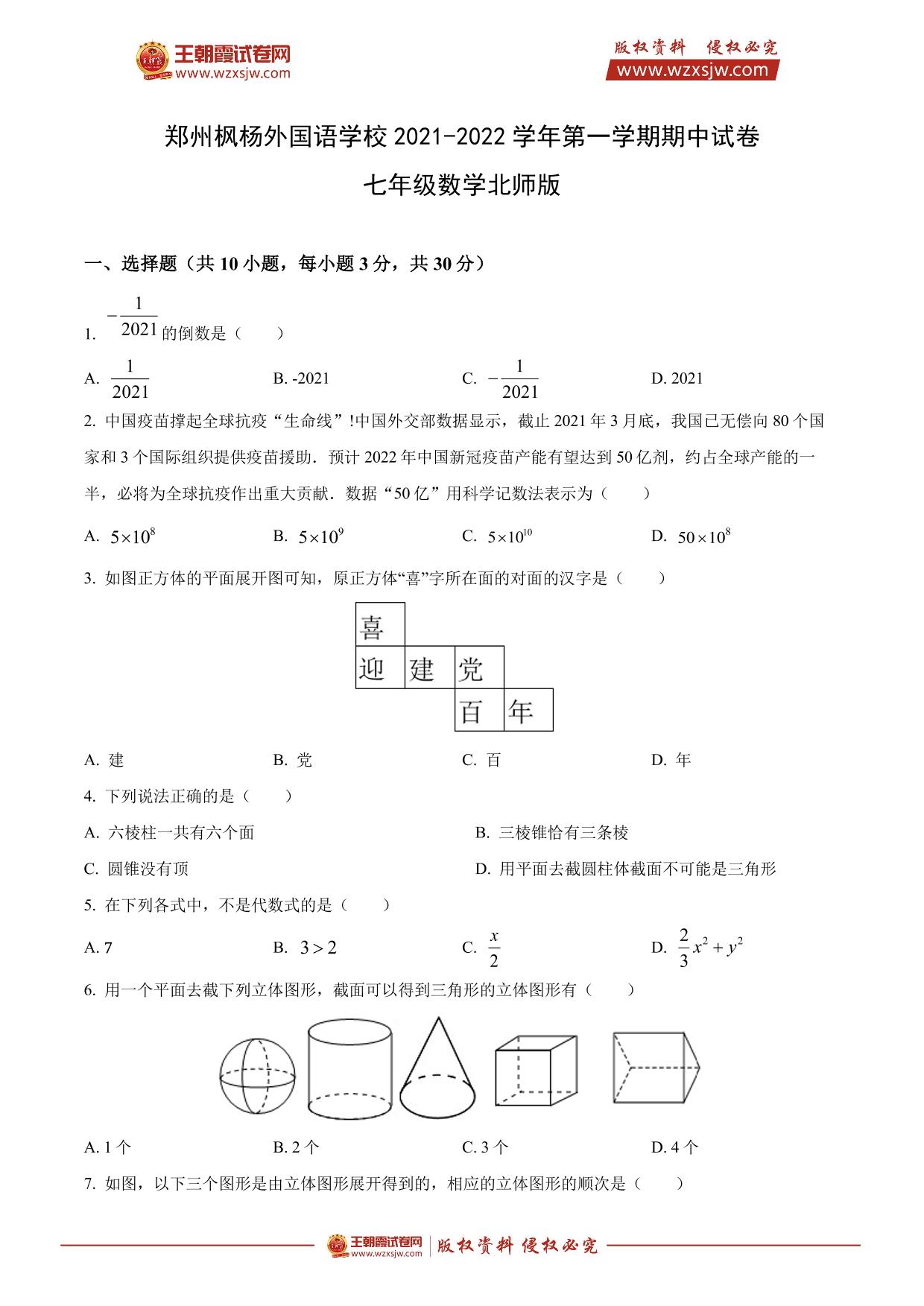 河南省郑州枫杨外国语学校2021-2022学年上学期期中试题七年级数学(北师版)