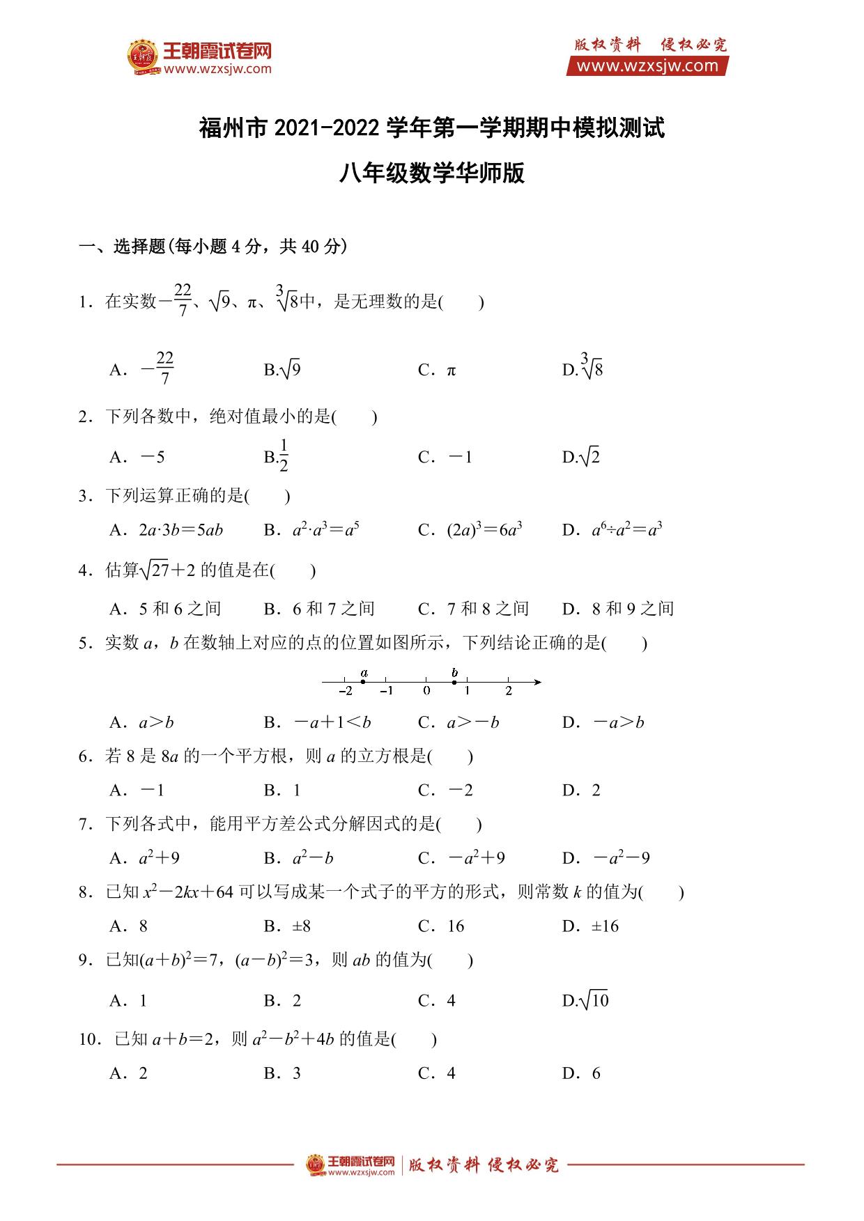 福建省福州市2021-2022学年上学期期中模拟测试八年级数学(华师版)