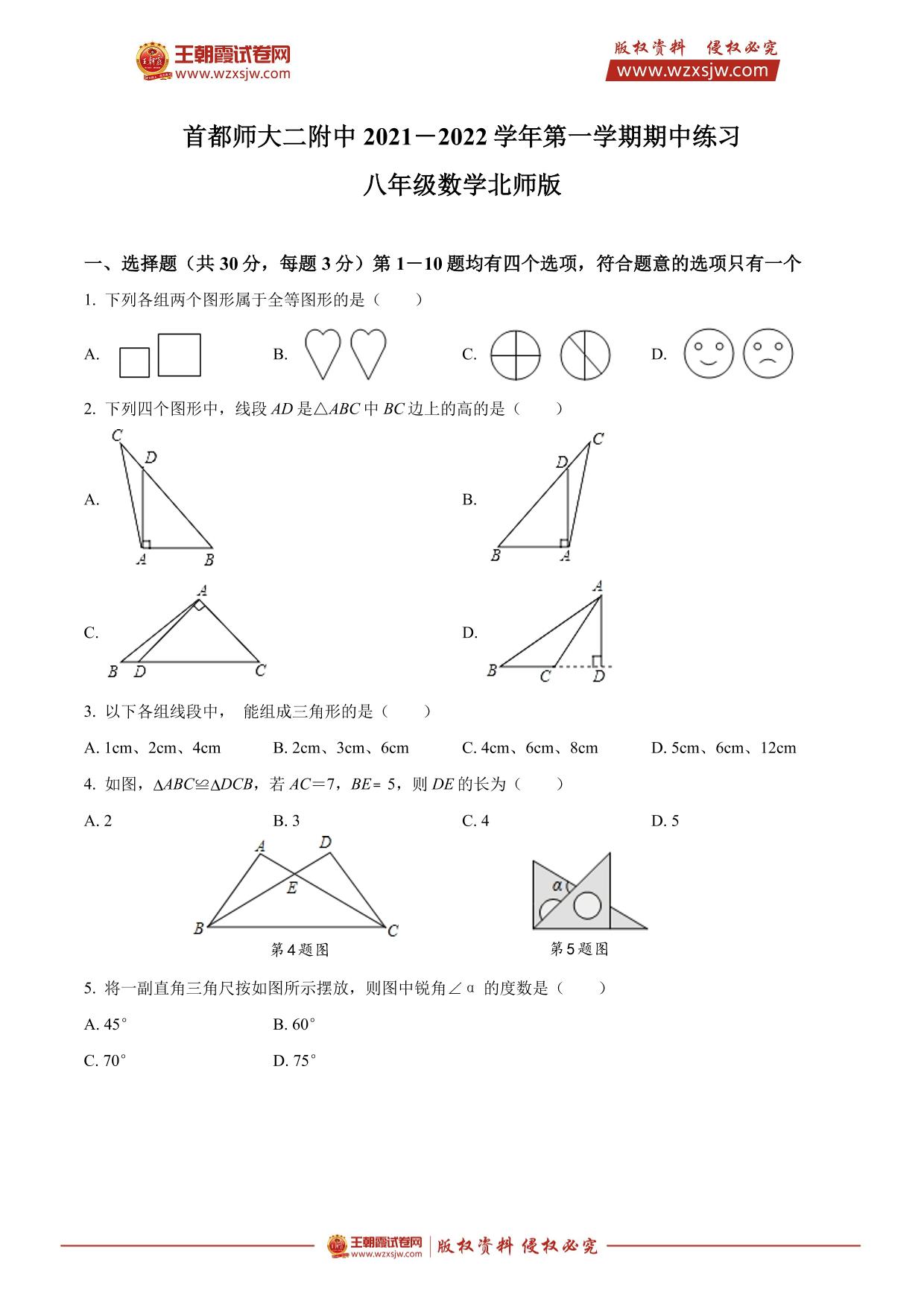 北京市首都师大二附中2021-2022学年第一学期期中练习八年级数学(北师版)