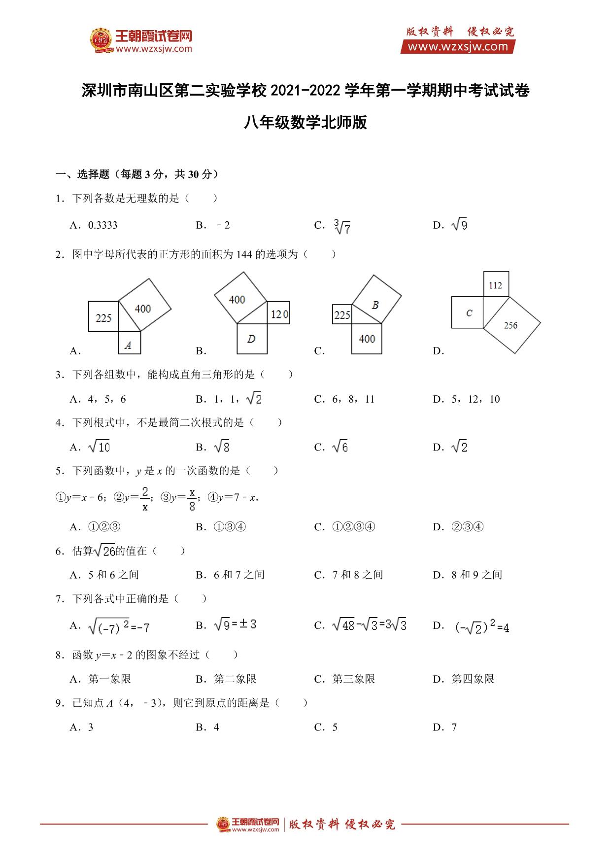 广东省深圳市南山区第二实验学校2021-2022学年上学期期中试卷八年级数学(北师版)