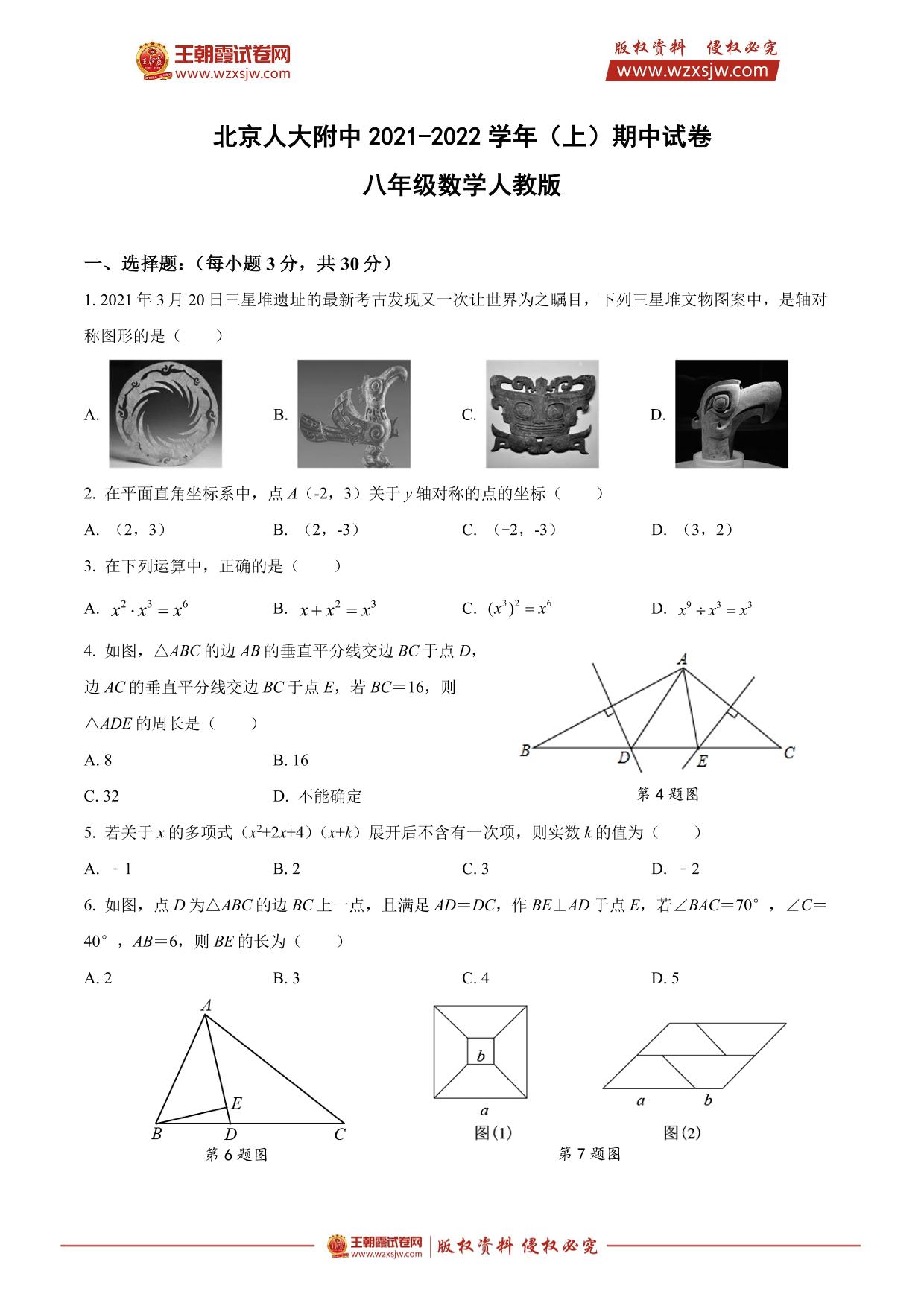 北京市海淀区中国人民大学附属中学2021-2022学年上学期期中试题八年级数学(人教版)