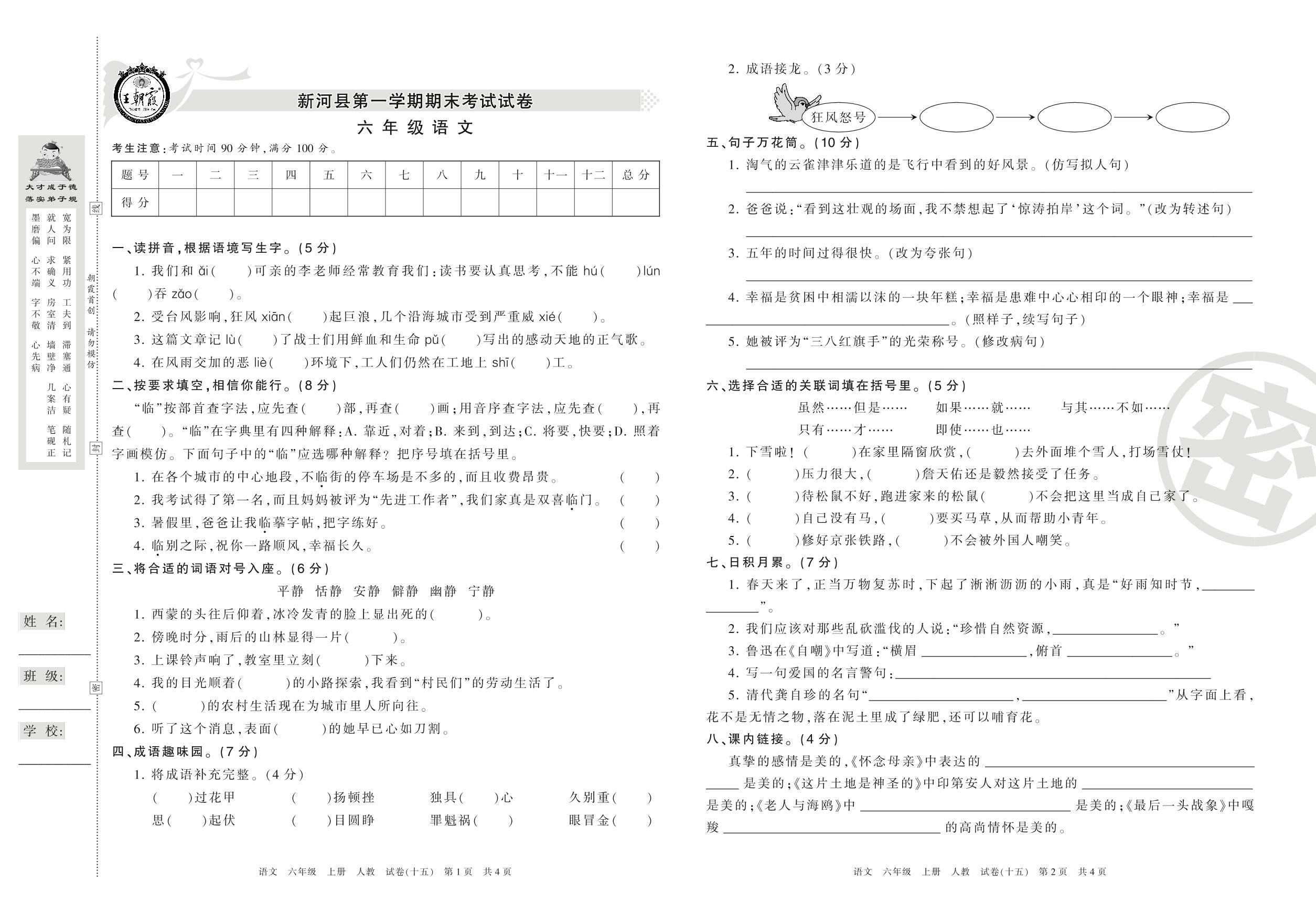 2016-2017学年第一学期邢台市新河县六年级语文试卷(人教版)【15】