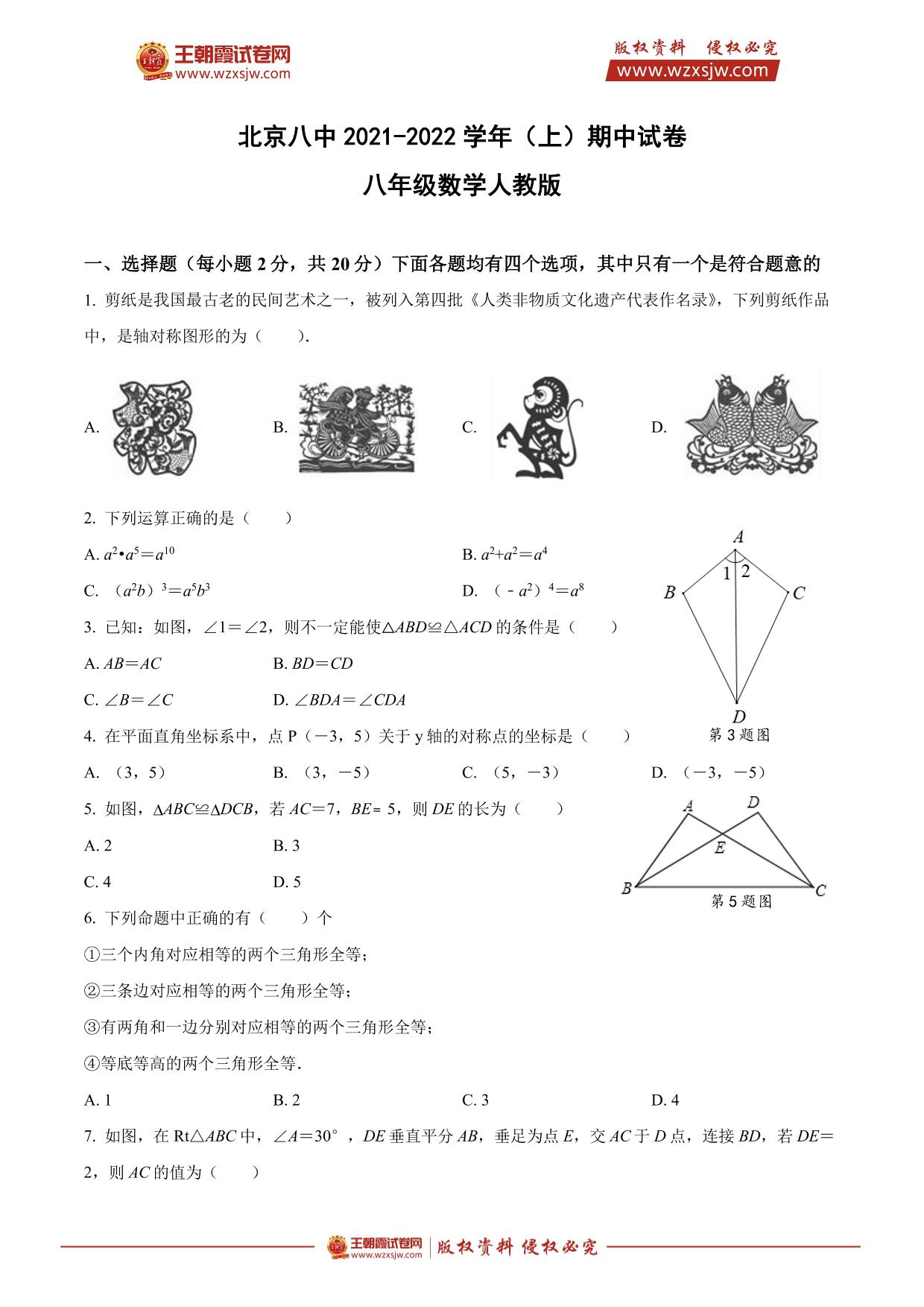 北京市第八中学2021-2022学年上学期期中试题八年级数学(人教版)
