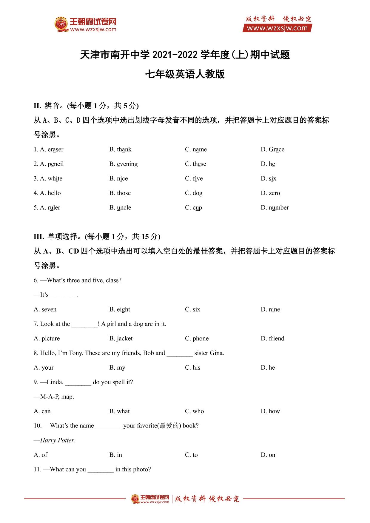 天津市南开中学2021-2022学年上学期期中试题七年级英语(人教版)【无听力音频】