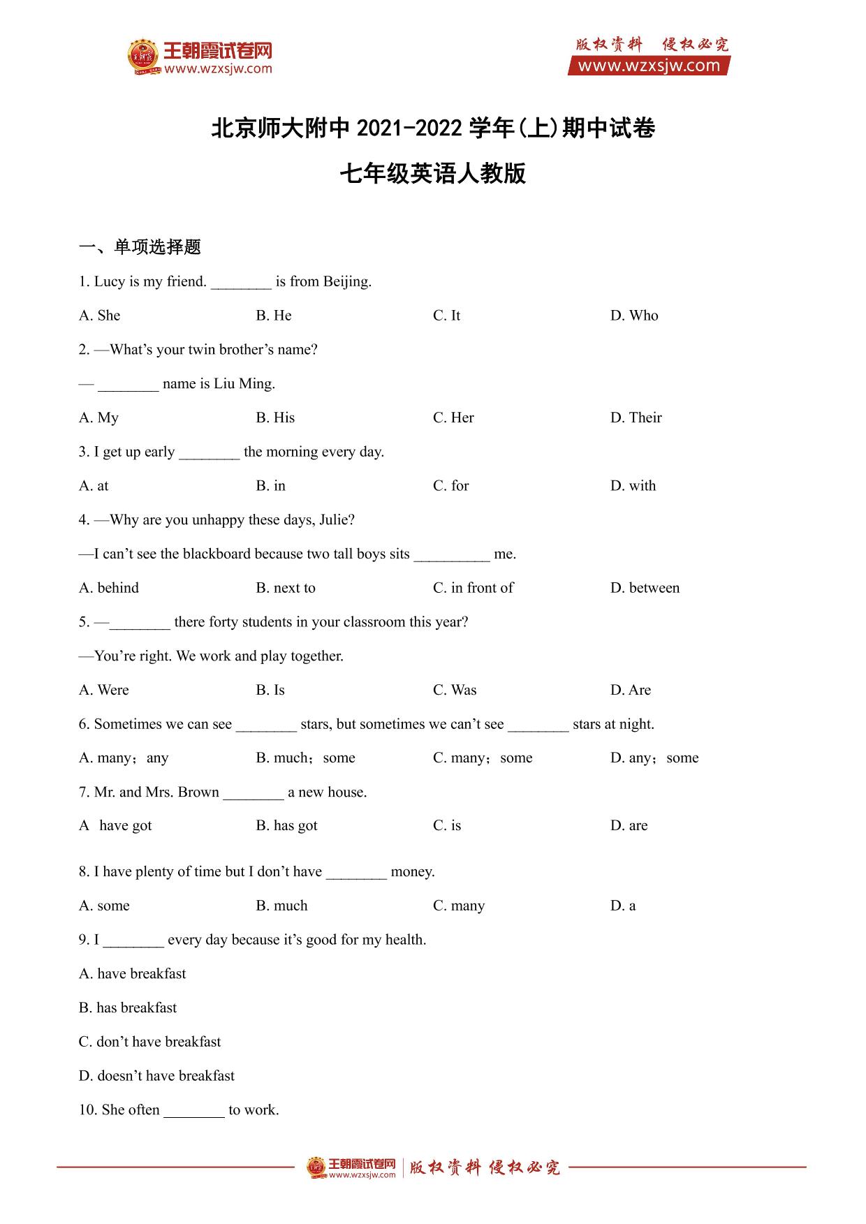 北京师范大学附属中学2021-2022学年上学期期中试题七年级英语(人教版)【无听力音频】