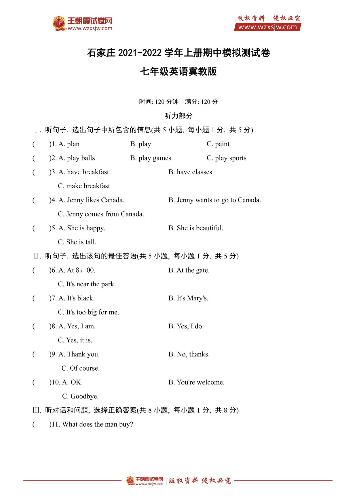 河北省石家庄市2021-2022学年上册期中模拟测试卷七年级英语(冀教版)【无听力音频】
