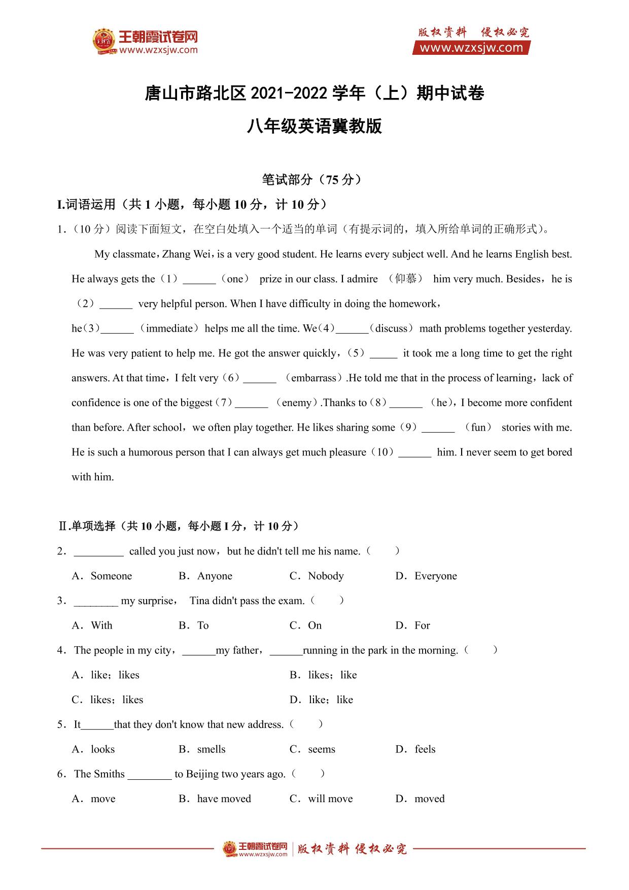 河北省唐山市路北区2021-2022学年上学期期中试卷八年级英语(冀教版)【无听力音频】