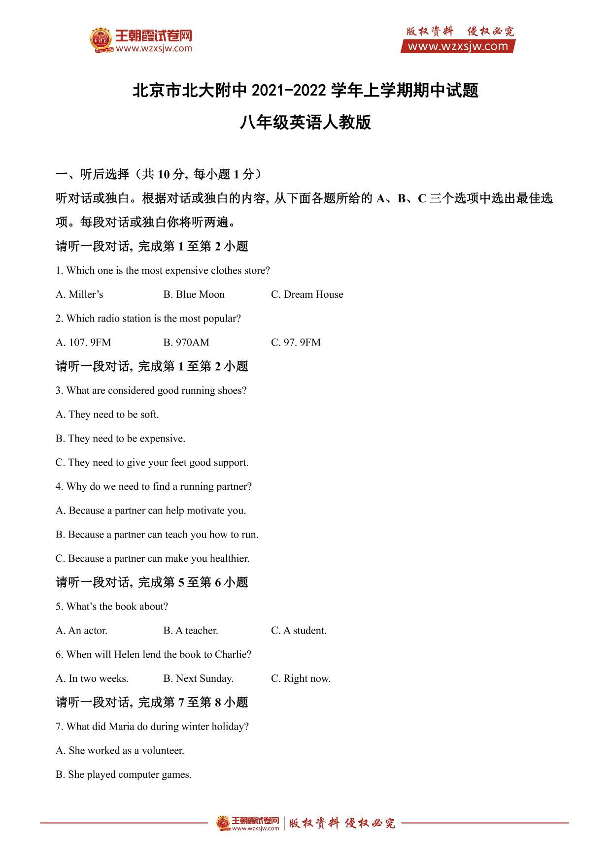 北京市北京大学附属中学2021-2022学年上学期期中试题八年级英语(人教版)【无听力音频】