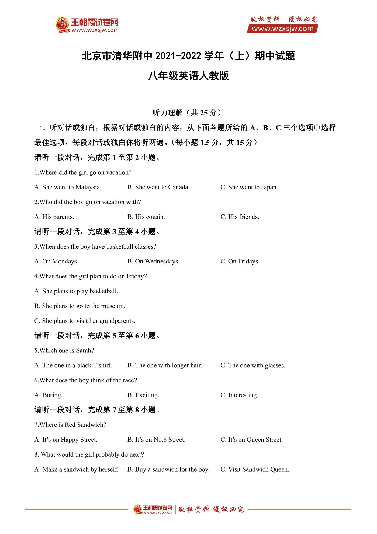 北京市清华大学附属中学2021-2022学年上学期期中试题八年级英语(人教版)【无听力音频】