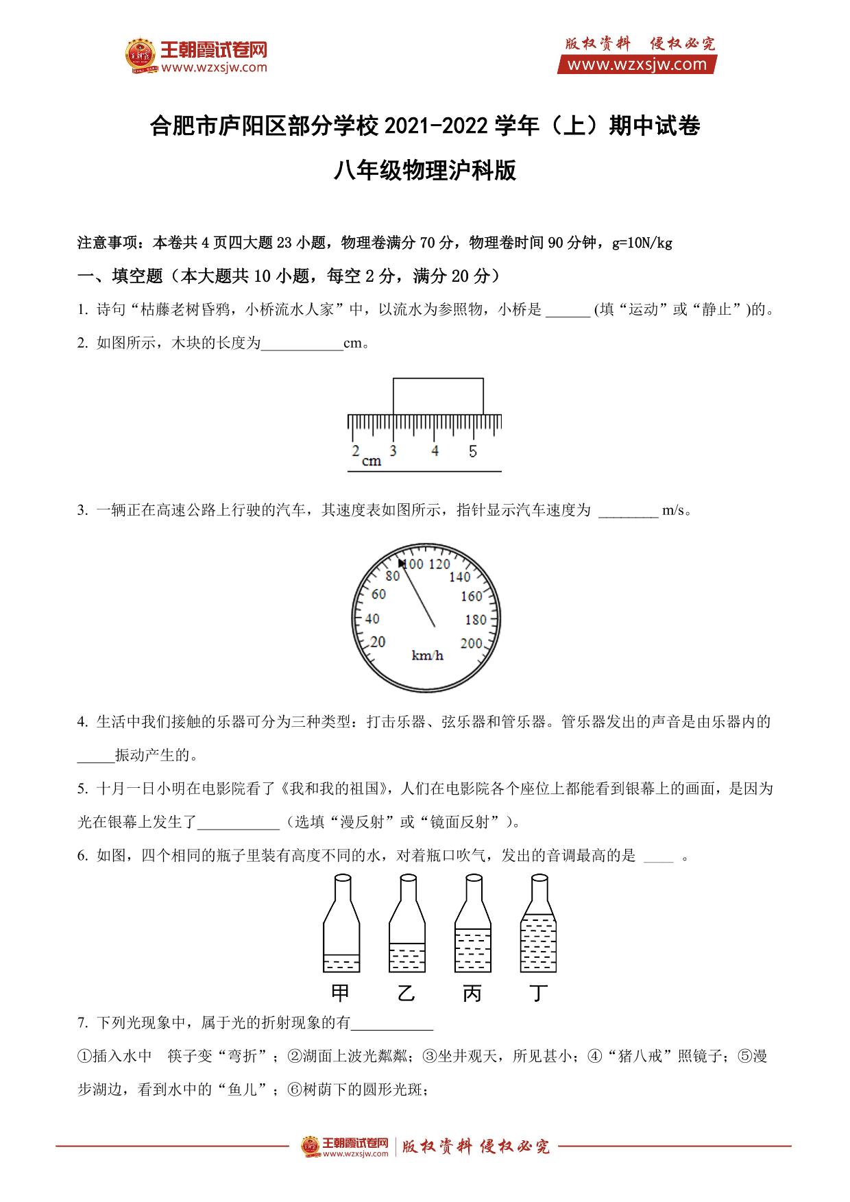 安徽省合肥市庐阳区部分学校2021-2022学年(上)期中试题八年级物理(沪科版)