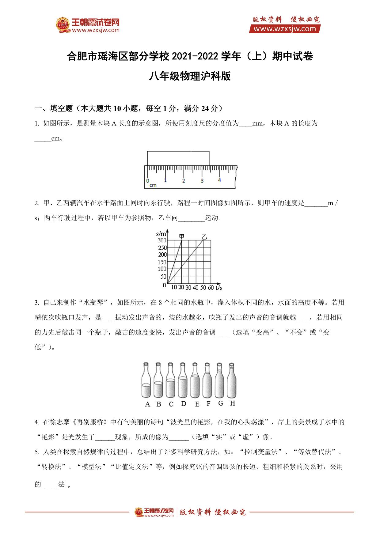 安徽省合肥市瑶海区部分学校2021-2022学年(上)期中试题八年级物理(沪科版)