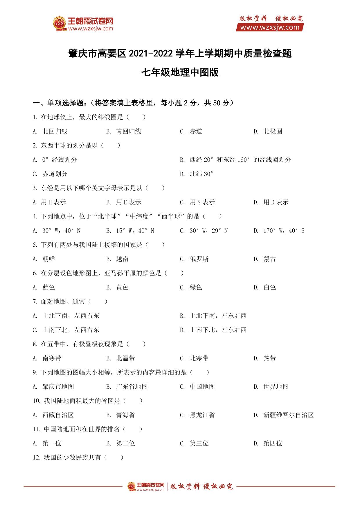 广东省肇庆市高要区2021-2022学年上学期期中试题七年级地理(中图版)