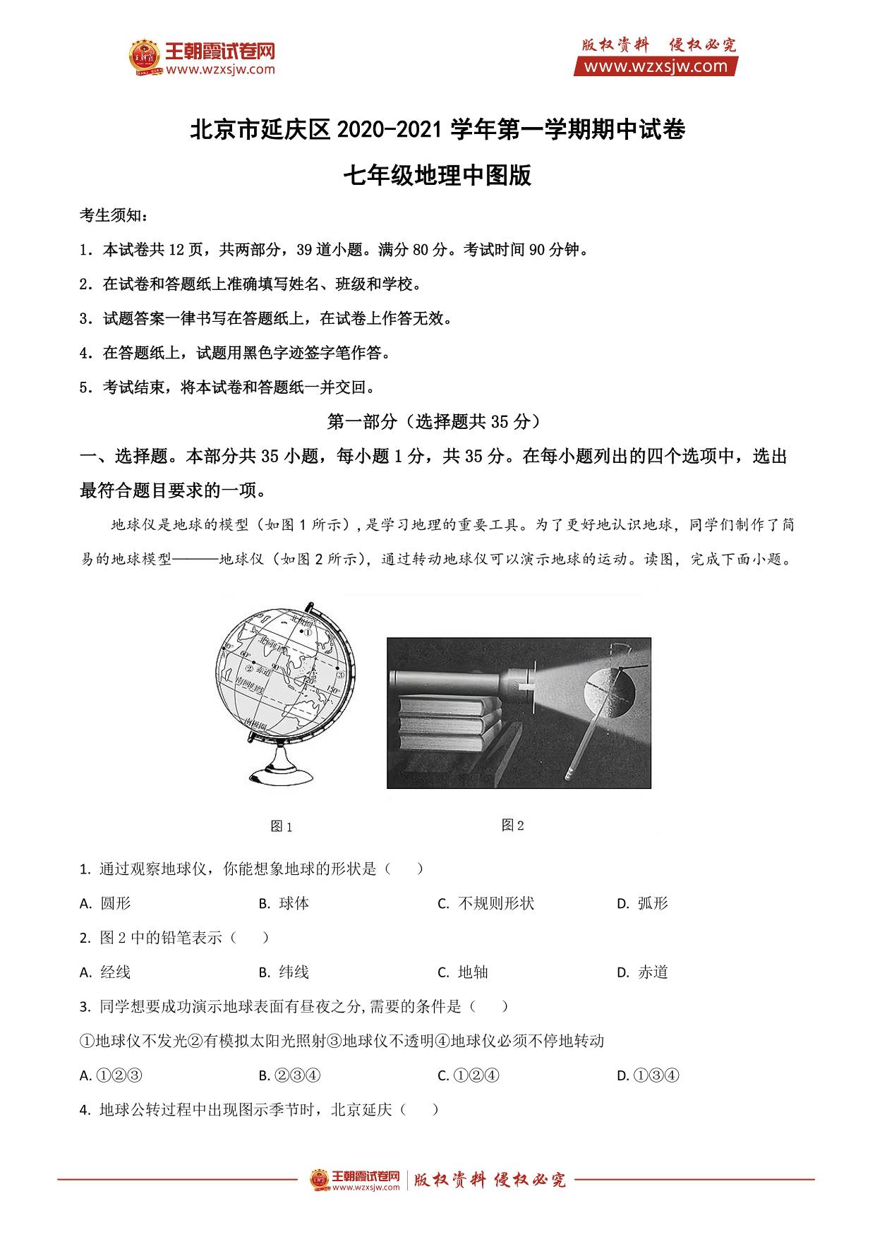 北京市延庆区2020-2021学年上学期期中试题七年级地理(中图版)