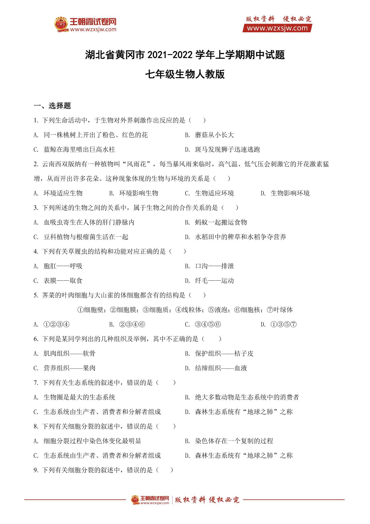 湖北省黄冈市2021-2022学年上学期期中试题七年级生物(人教版)