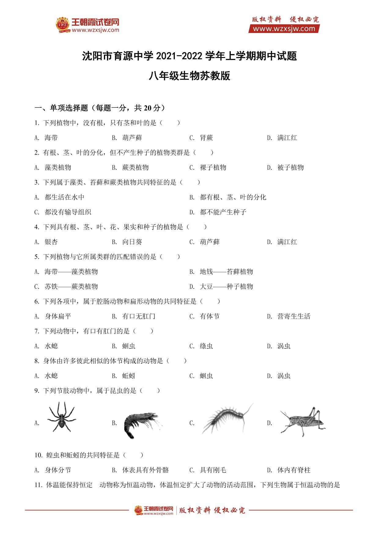 辽宁省沈阳市育源中学2021-2022学年上学期期中试题八年级生物(苏教版)