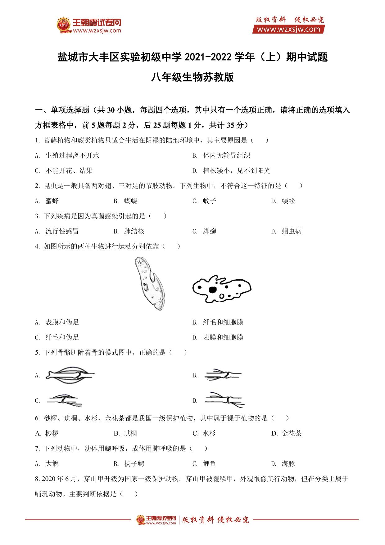 江苏省盐城市大丰区实验初级中学2021-2022学年上学期期中试题八年级生物(苏教版)