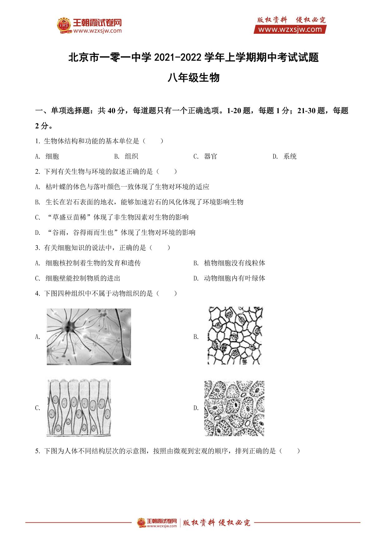 北京市一零一中学2021-2022学年上学期期中试题八年级生物(人教版)