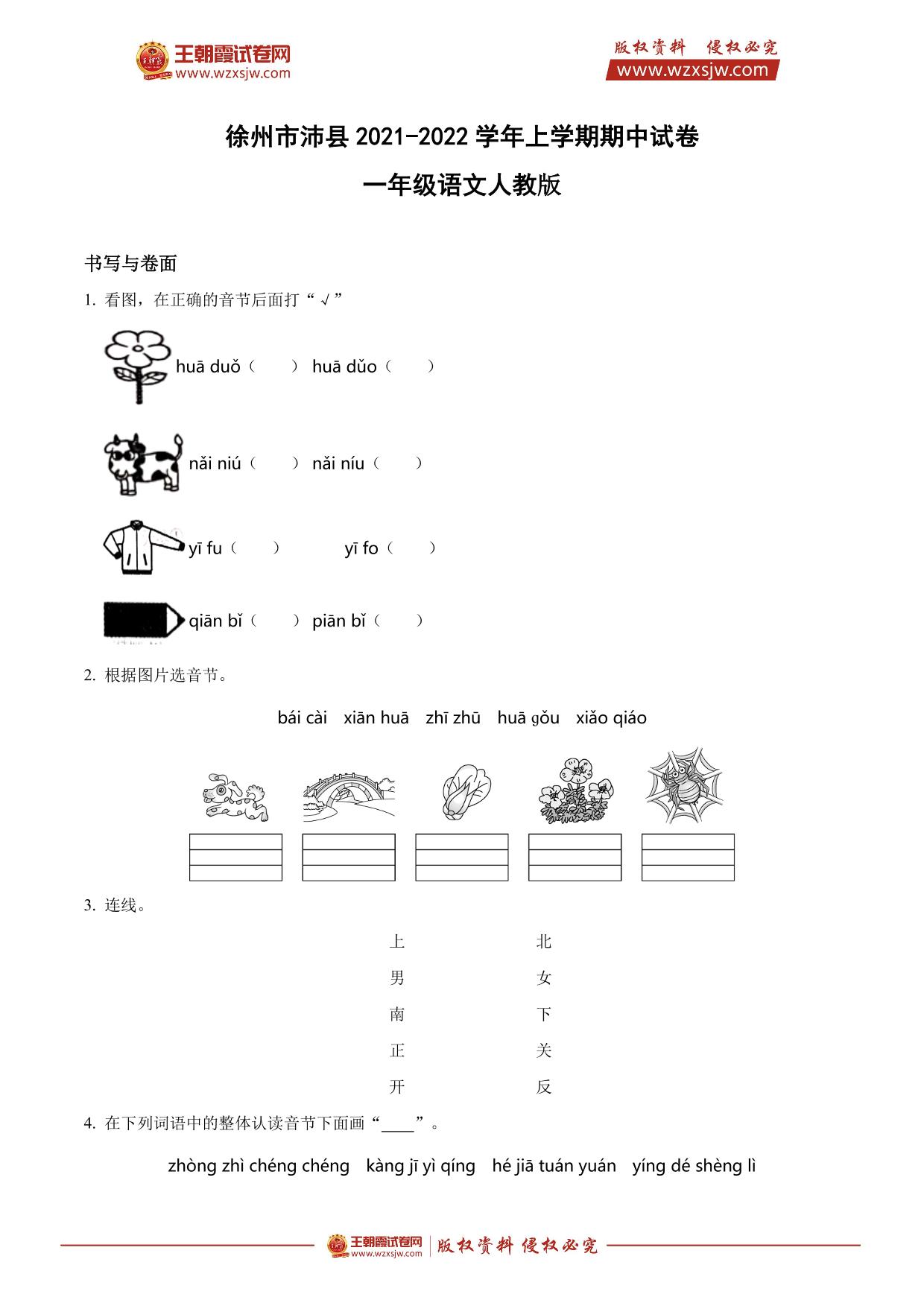 江苏省徐州市沛县2021-2022学年上学期期中考试试卷一年级语文(人教版)