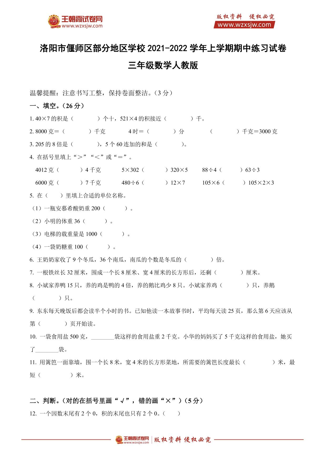 河南省洛阳市偃师区部分学校2021-2022学年上学期期中练习试卷三年级数学(人教版)