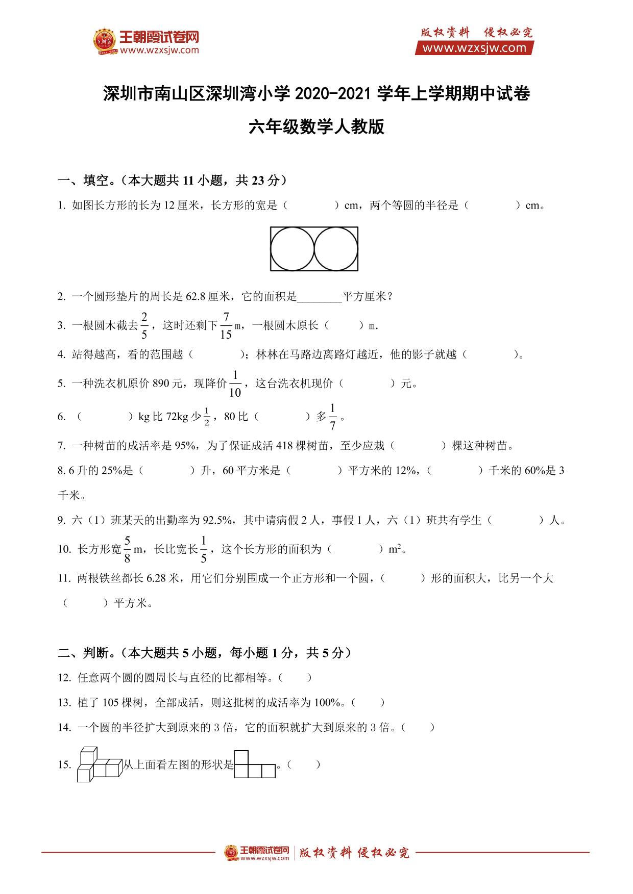 广东省深圳市南山区深圳湾小学2020-2021学年上学期期中考试试卷六年级数学(人教版)