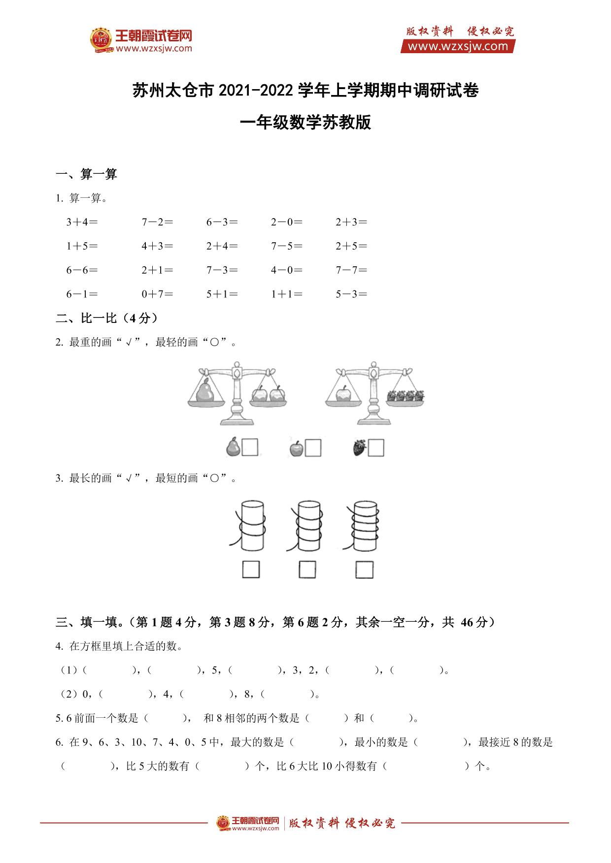 江苏苏州太仓市2021-2022学年上学期期中调研试卷一年级数学(苏教版)