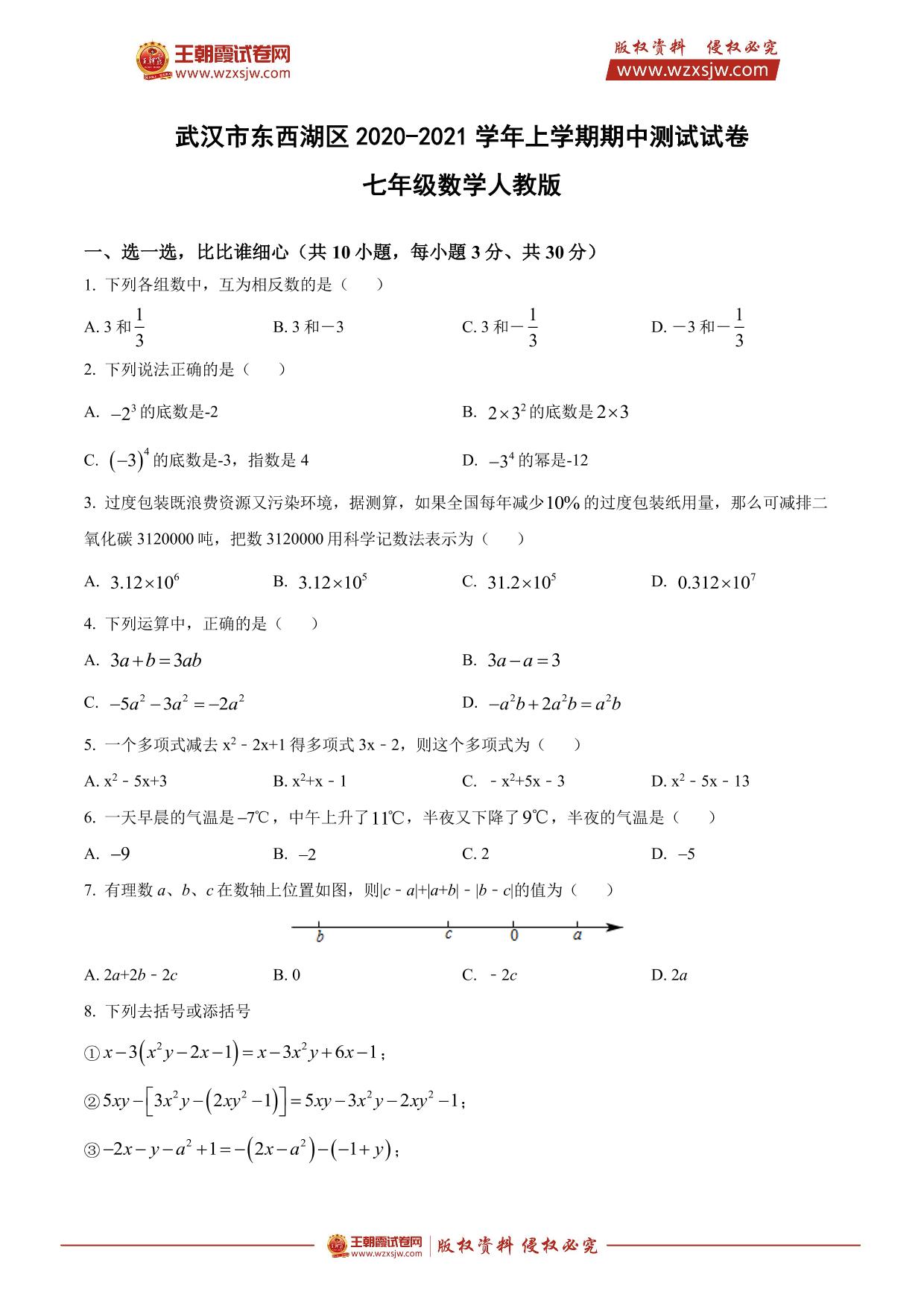 湖北省武汉市东西湖区2020-2021学年上学期期中试卷七年级数学(人教版)
