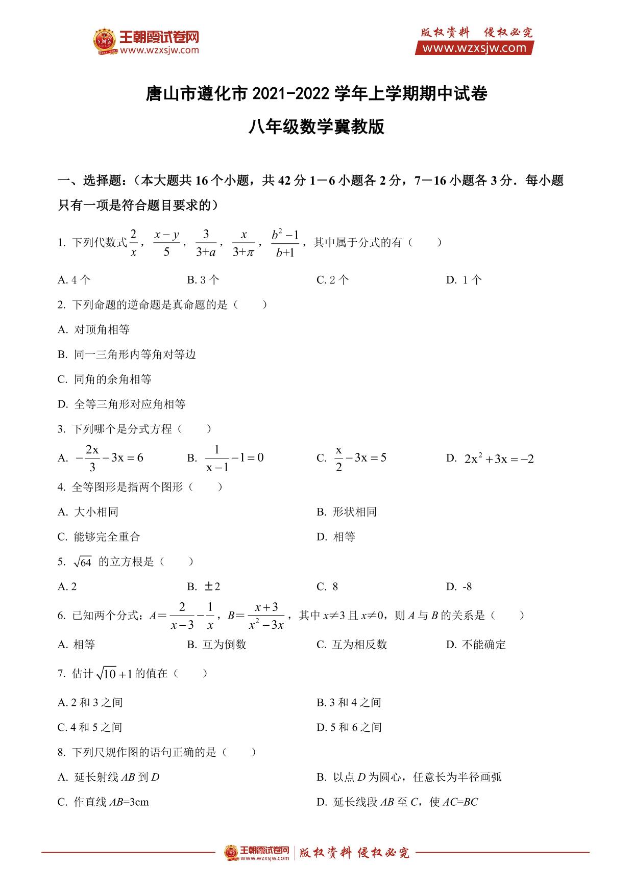 河北省唐山市遵化市2021-2022学年上学期期中试卷八年级数学(冀教版)