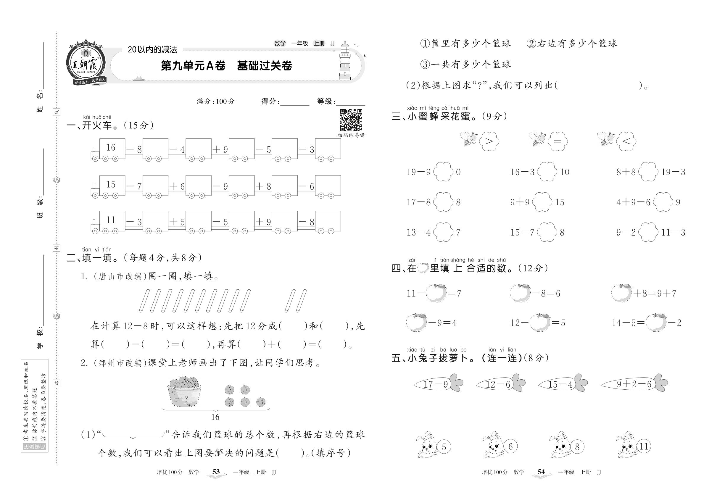 2022上册一年级数学冀教版 第九单元A卷 基础过关卷