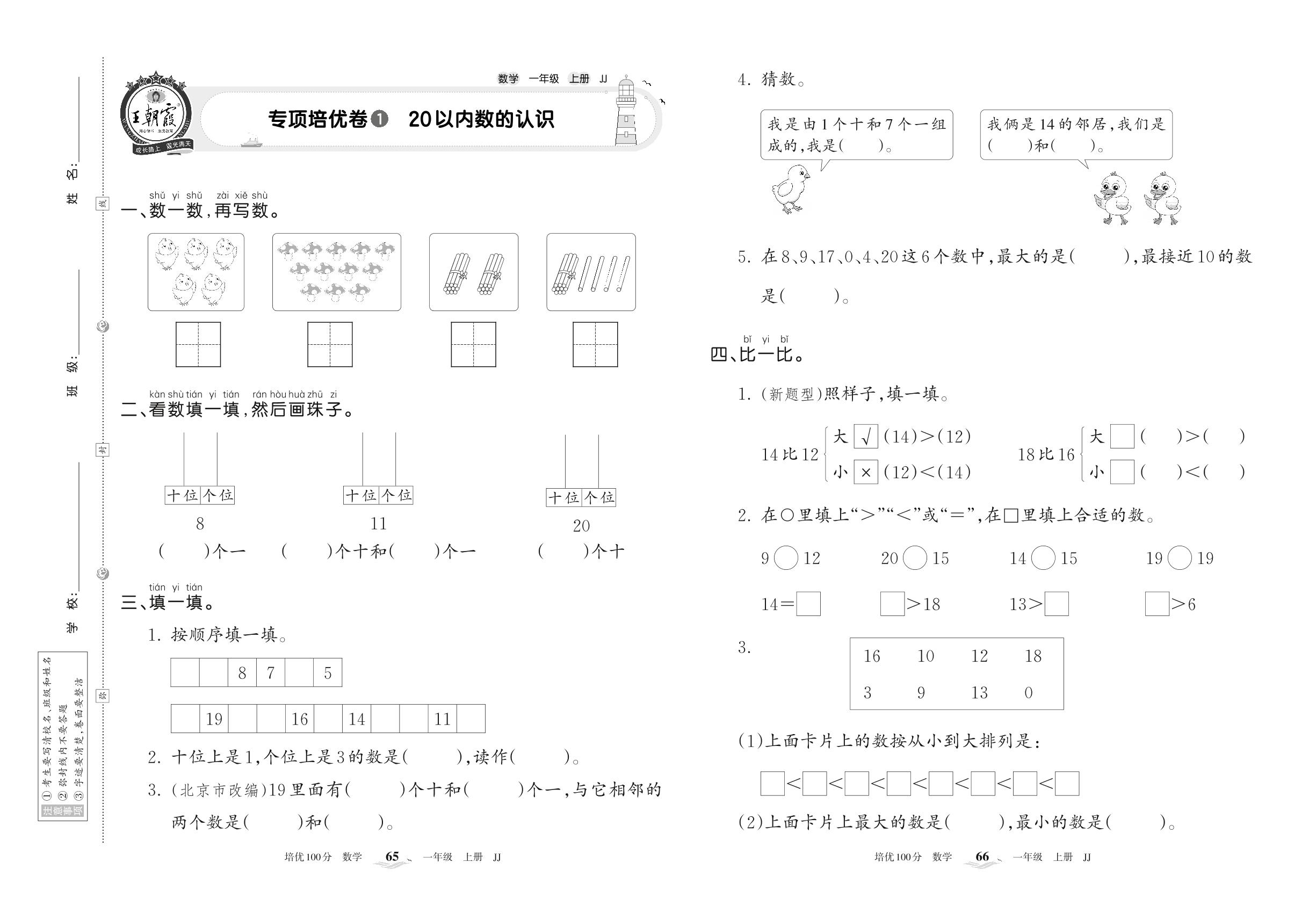 2022上册一年级数学冀教版 专项培优卷1 20以内数的认识
