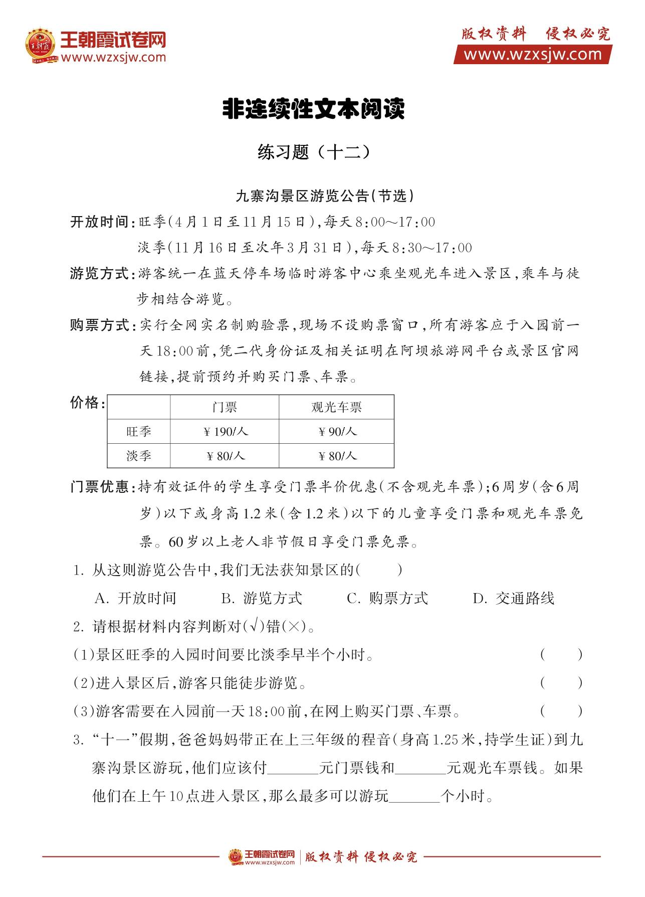 人教版三年级上册·非连续性文本阅读练习题12