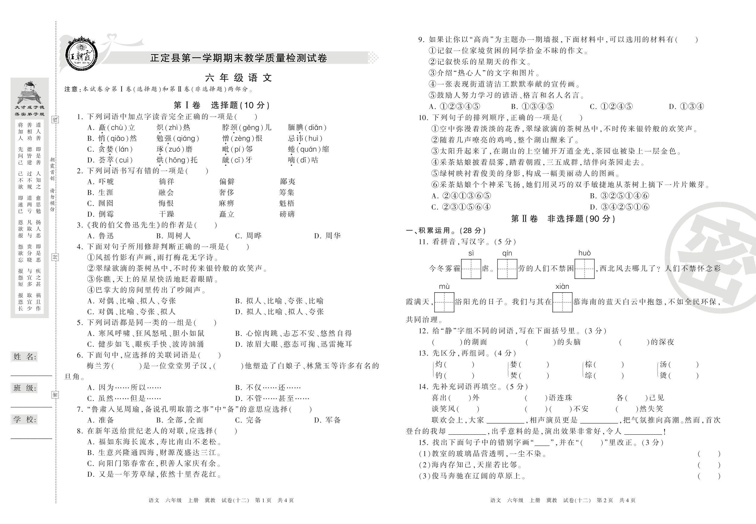 2016-2017学年第一学期石家庄市正定县六年级语文试卷(冀教版)【12】