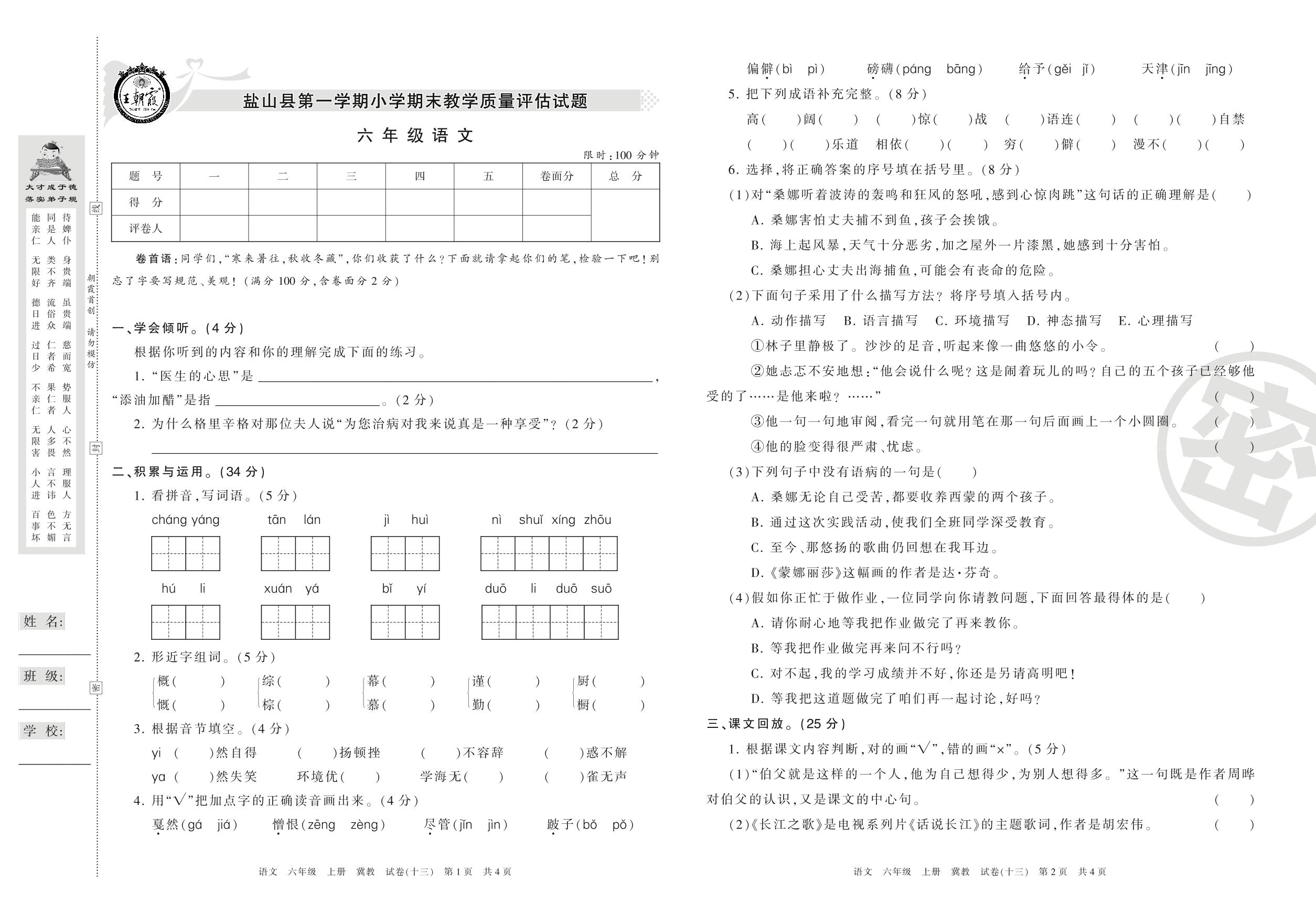 2016-2017学年第一学期沧州市盐山县六年级语文试卷(冀教版)【13】